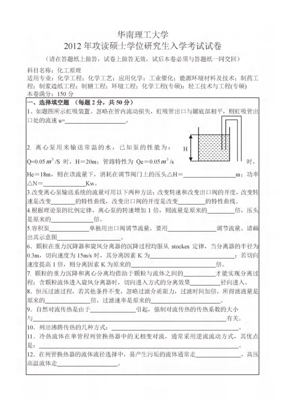 华南理工大学821化工原理2012年考研真题
