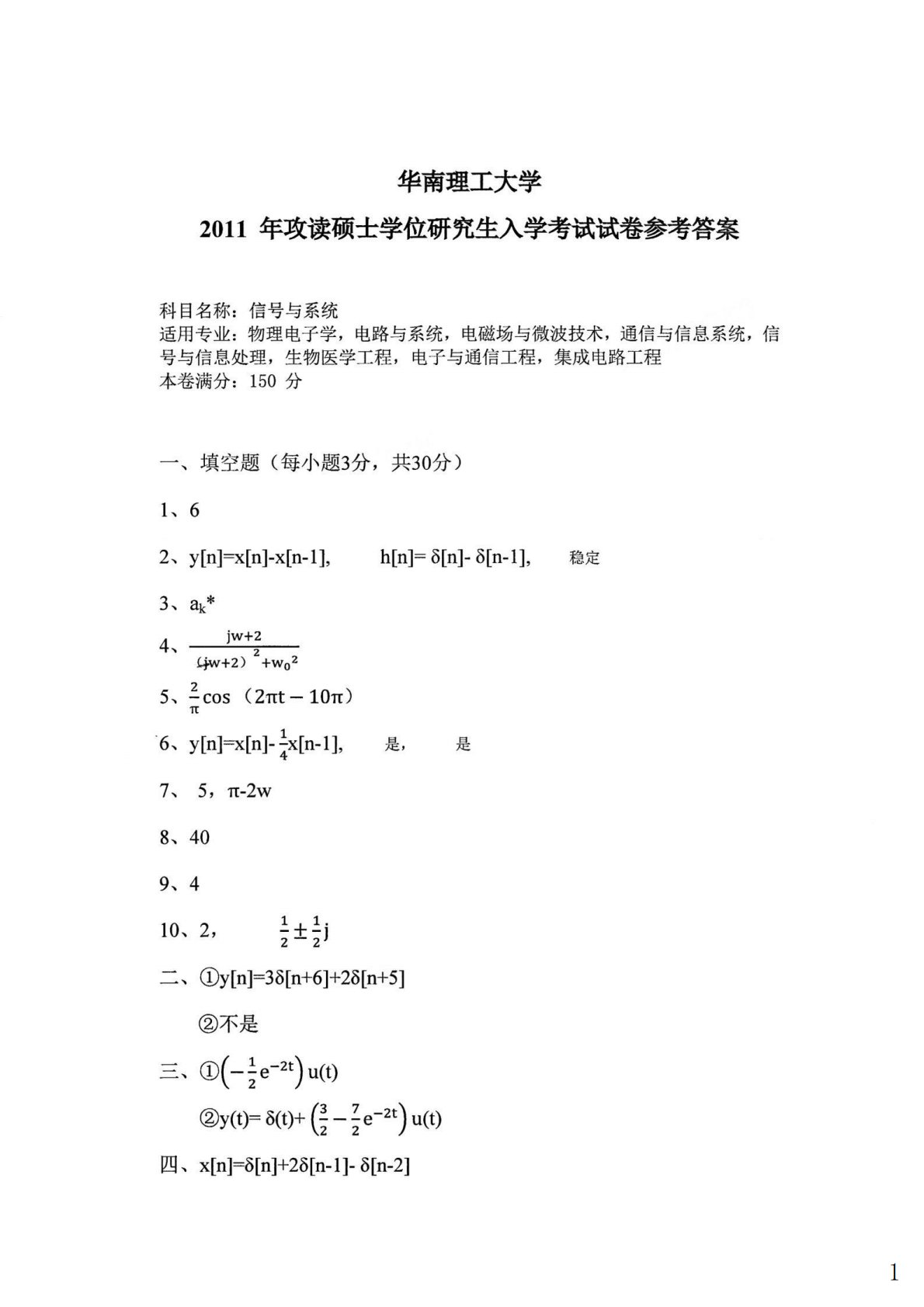 华南理工大学811信号与系统2011年真题答案