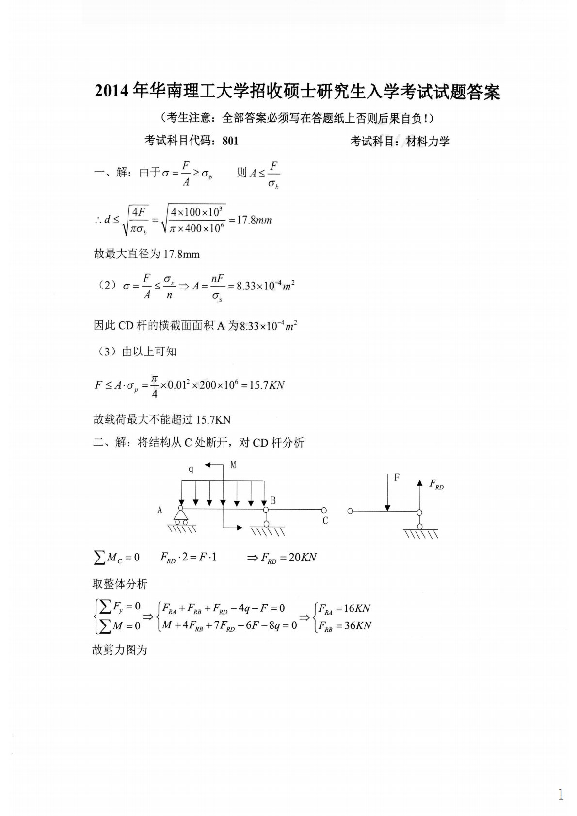 华南理工大学807材料力学2014年真题答案