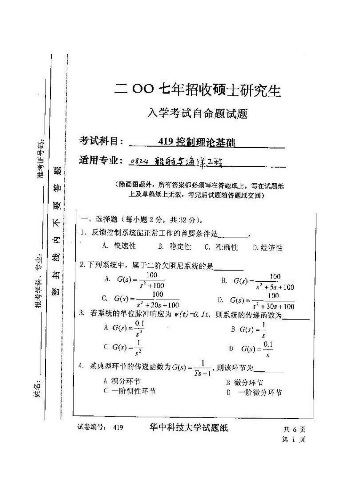 华中科技大学829自动控制原理(含经典控制理论、现代控制理论)2007年真题2