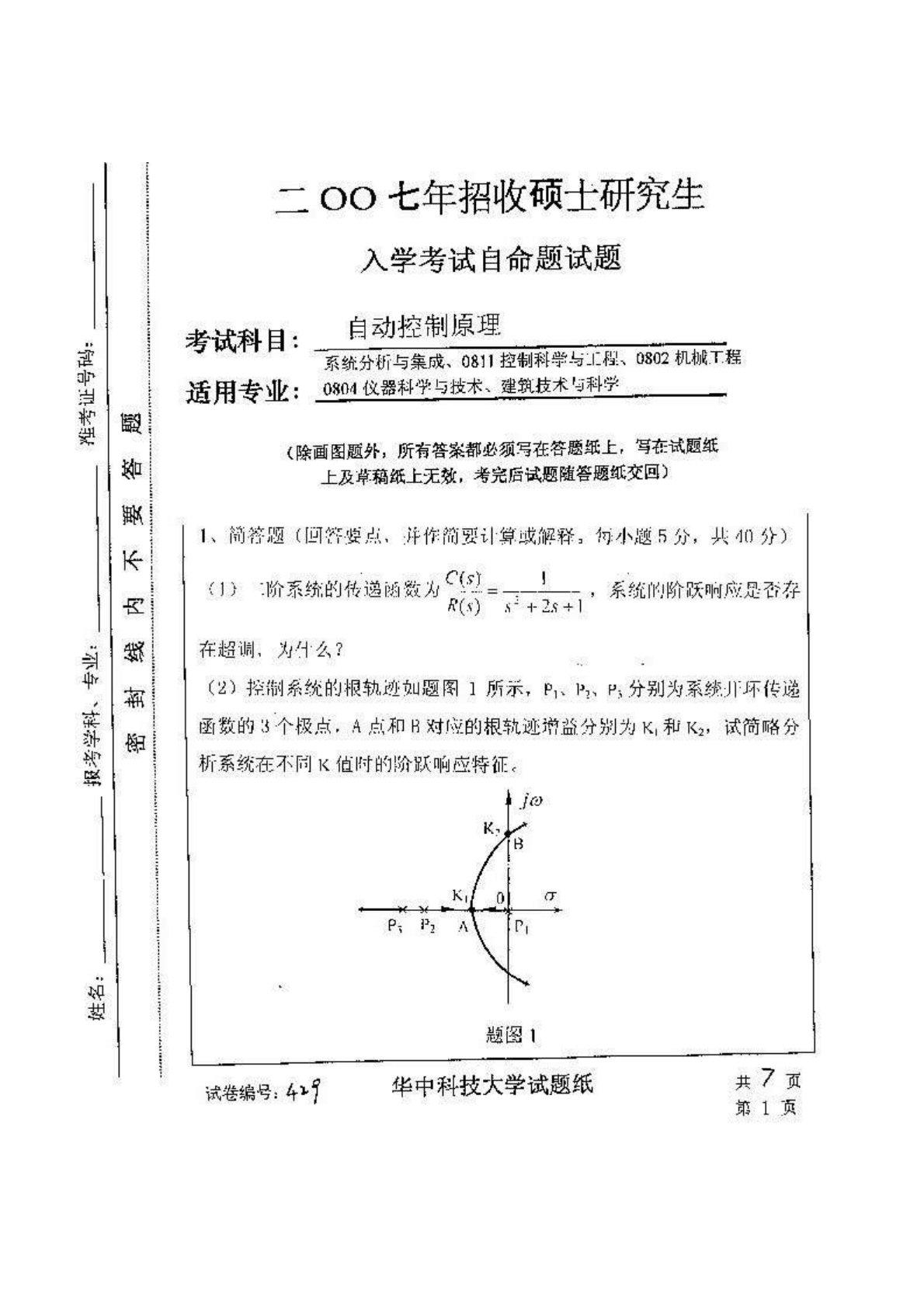 华中科技大学829自动控制原理(含经典控制理论、现代控制理论)2007年真题