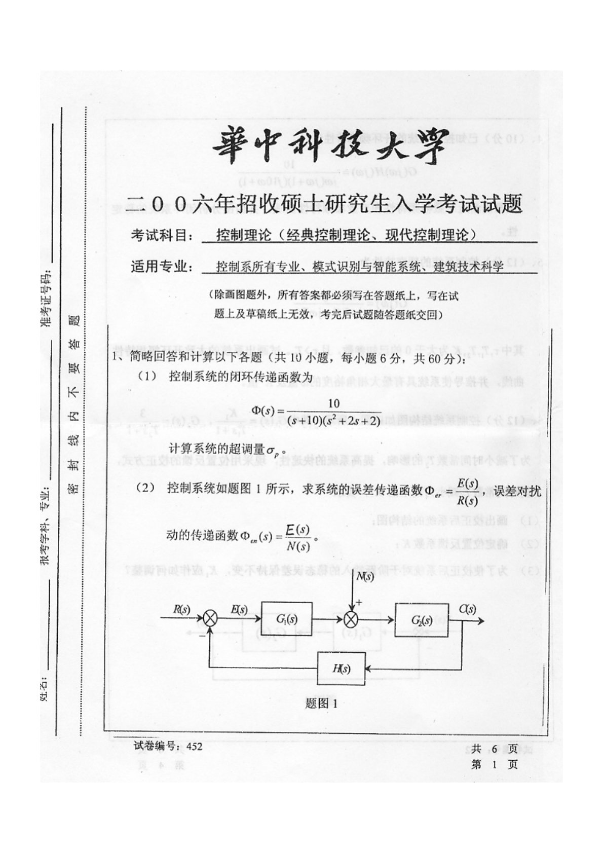 华中科技大学829自动控制原理(含经典控制理论、现代控制理论)2006年真题1