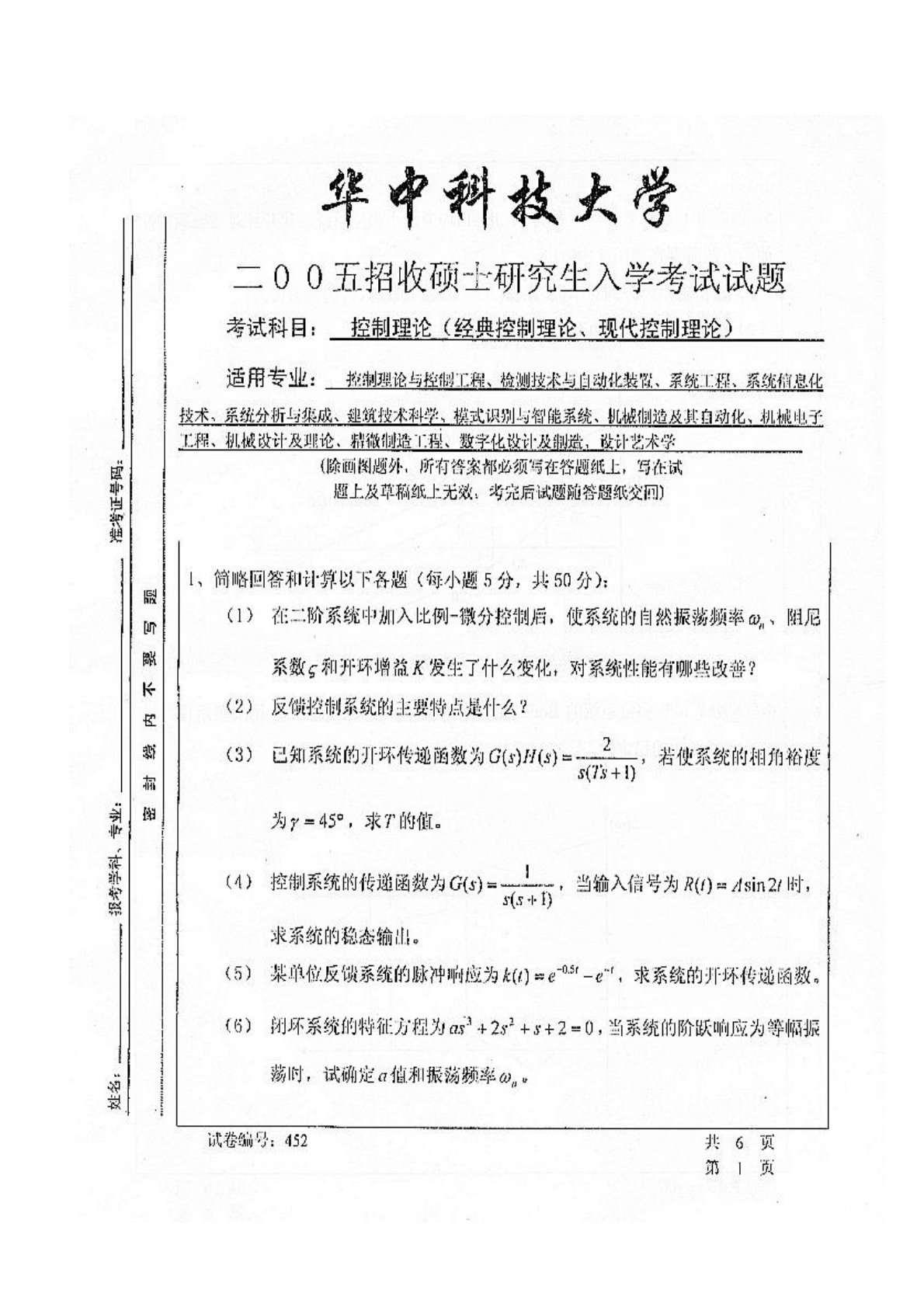 华中科技大学829自动控制原理(含经典控制理论、现代控制理论)2005年真题2