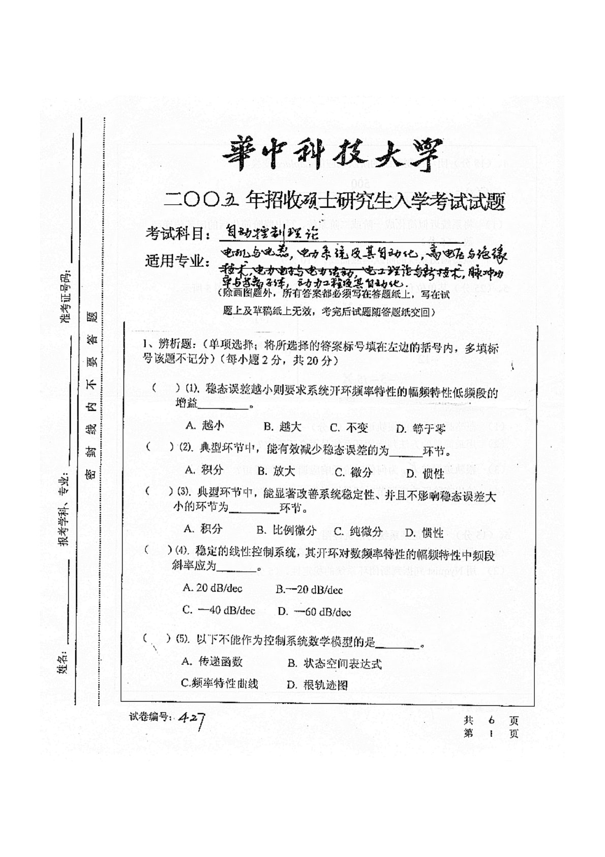 华中科技大学829自动控制原理(含经典控制理论、现代控制理论)2005年真题1