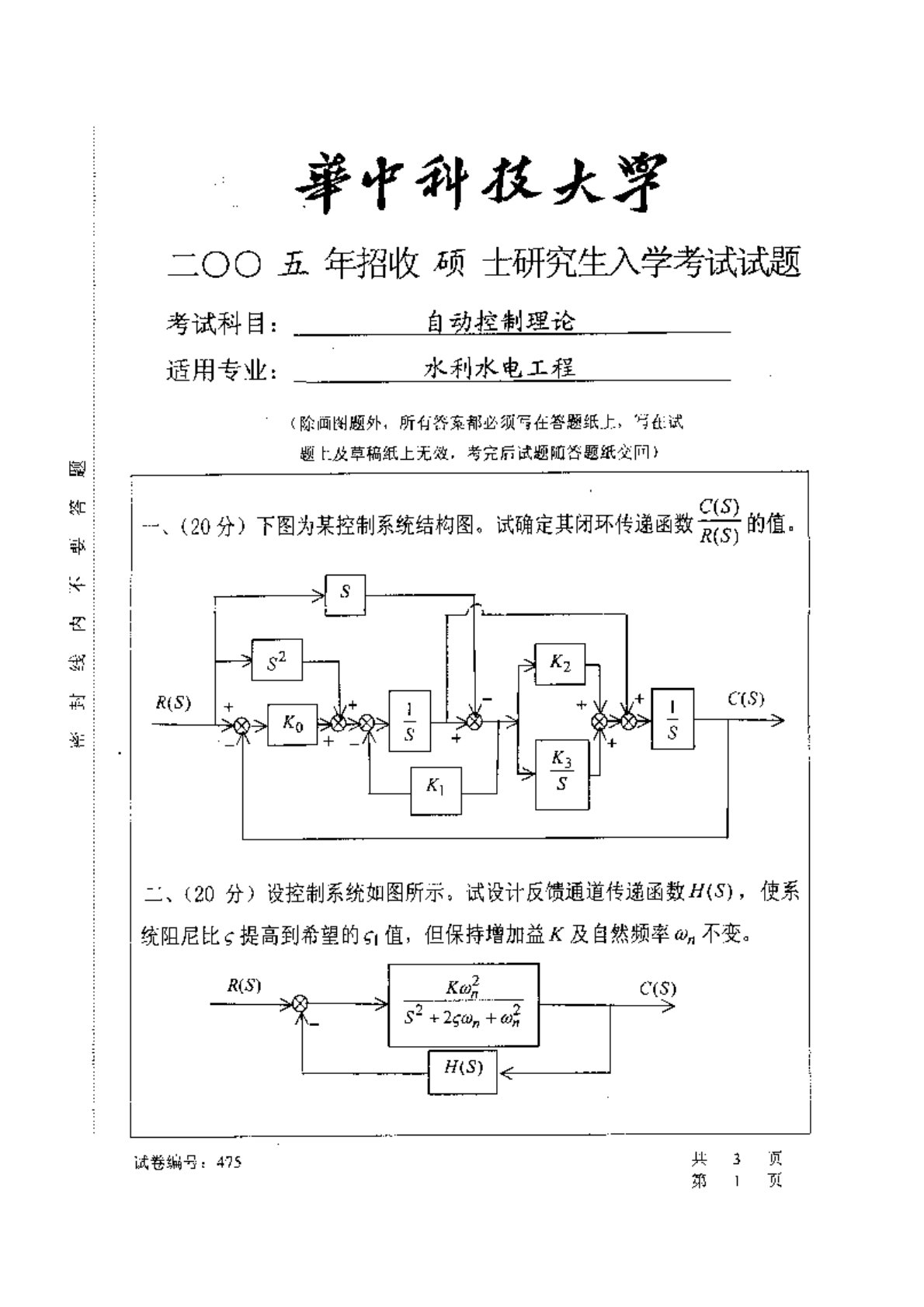 华中科技大学829自动控制原理(含经典控制理论、现代控制理论)2005年真题