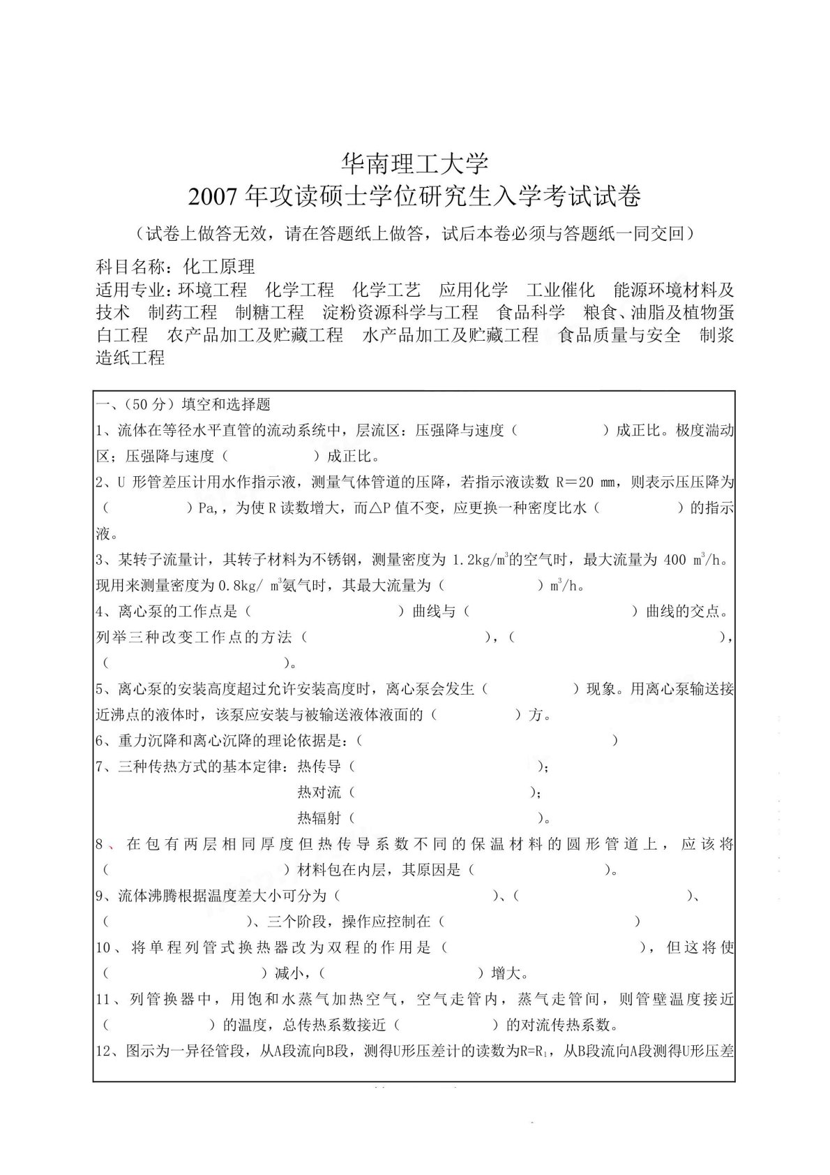 华南理工大学821化工原理2007年考研真题