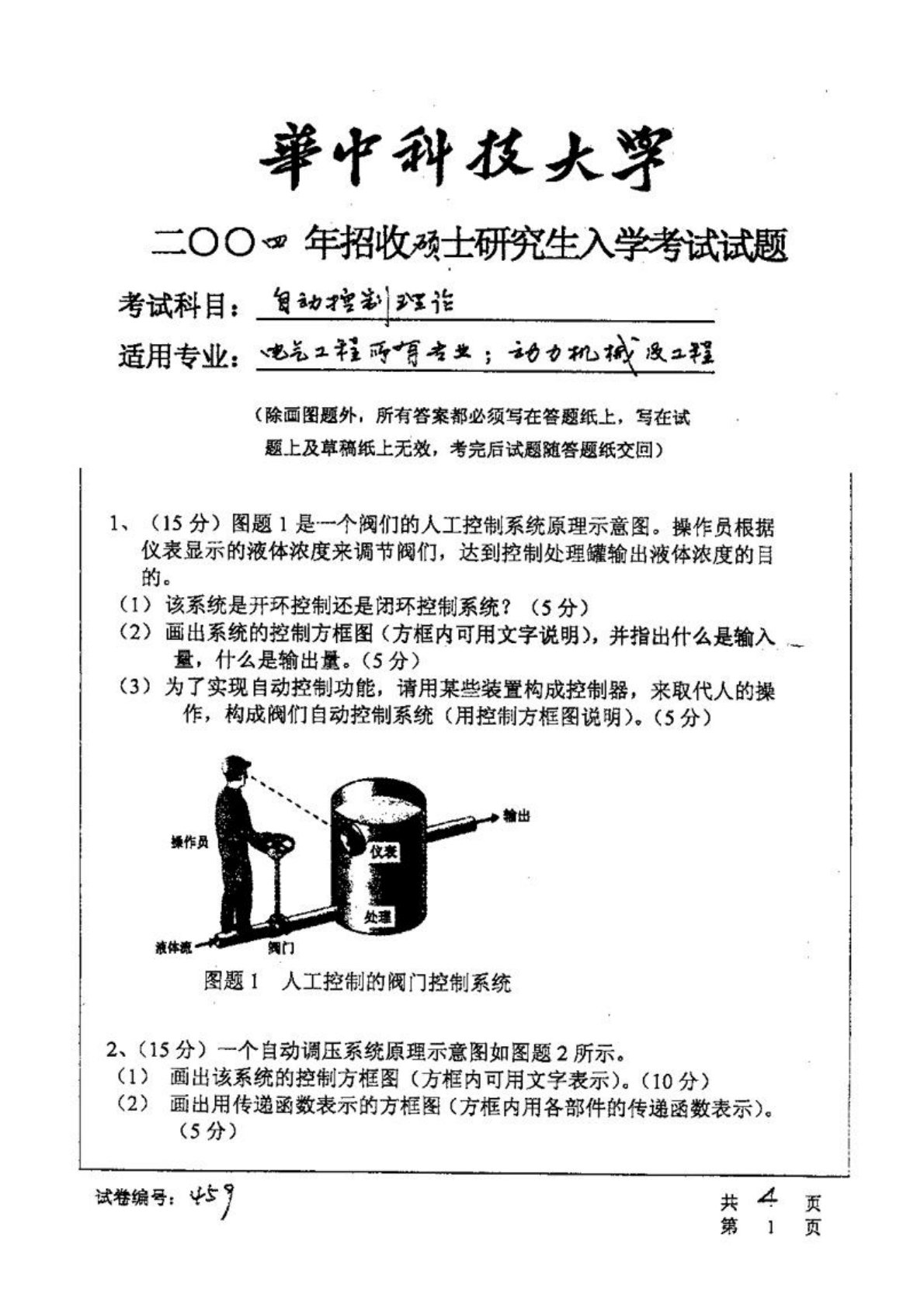 华中科技大学829自动控制原理(含经典控制理论、现代控制理论)2004年真题1