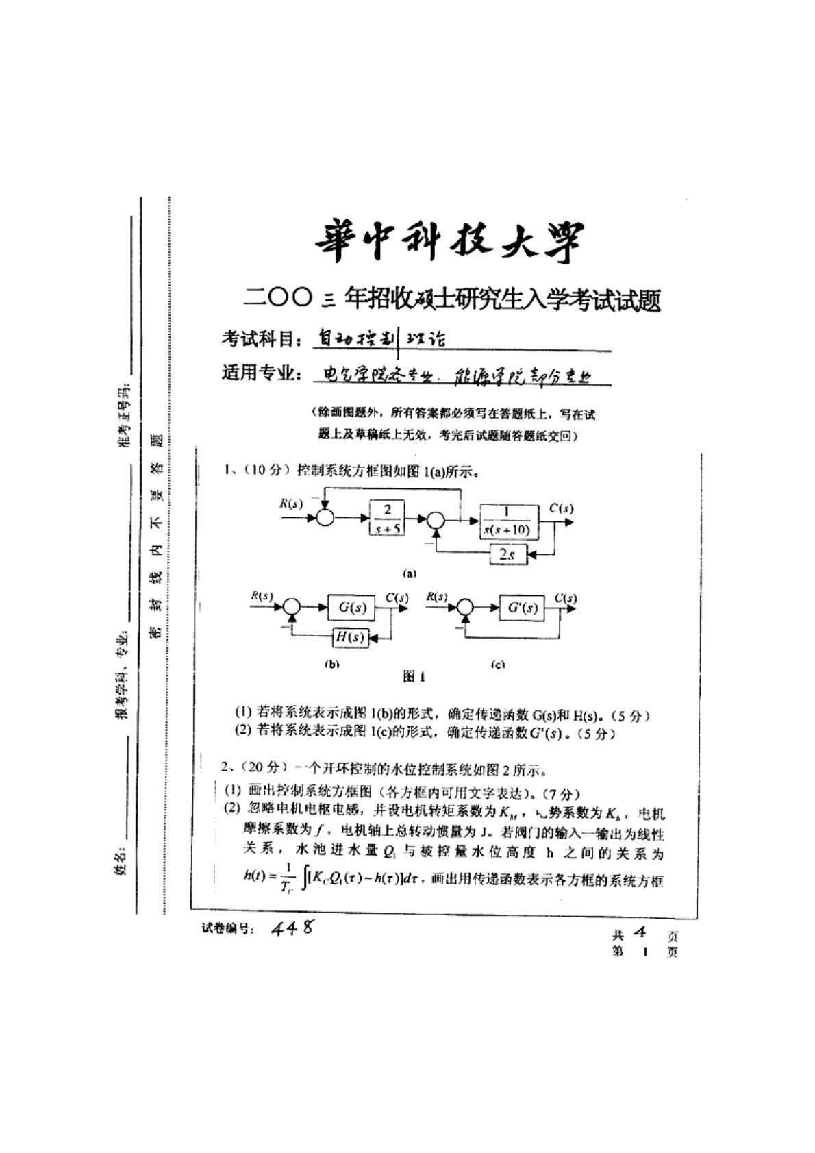 华中科技大学829自动控制原理(含经典控制理论、现代控制理论)2003年真题1