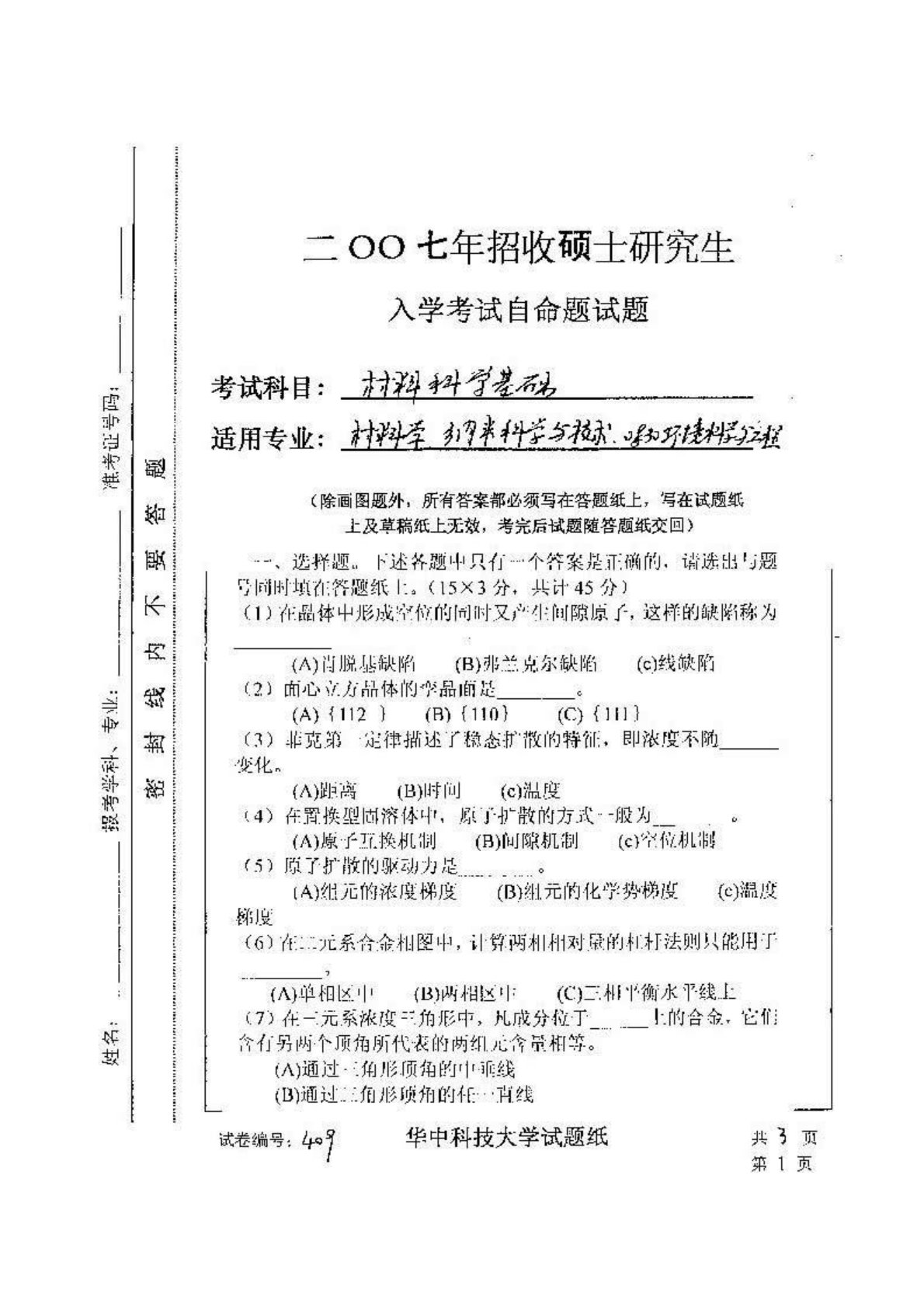 华中科技大学809材料科学基础2007年真题