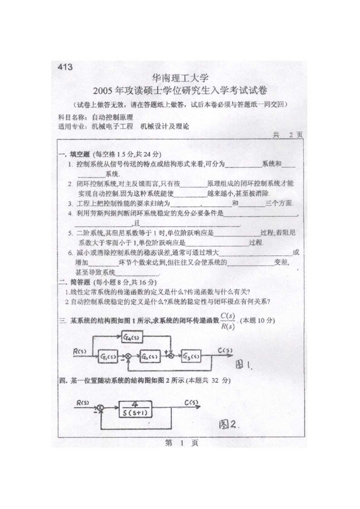 华南理工大学2005年814自动控制原理考研真题1