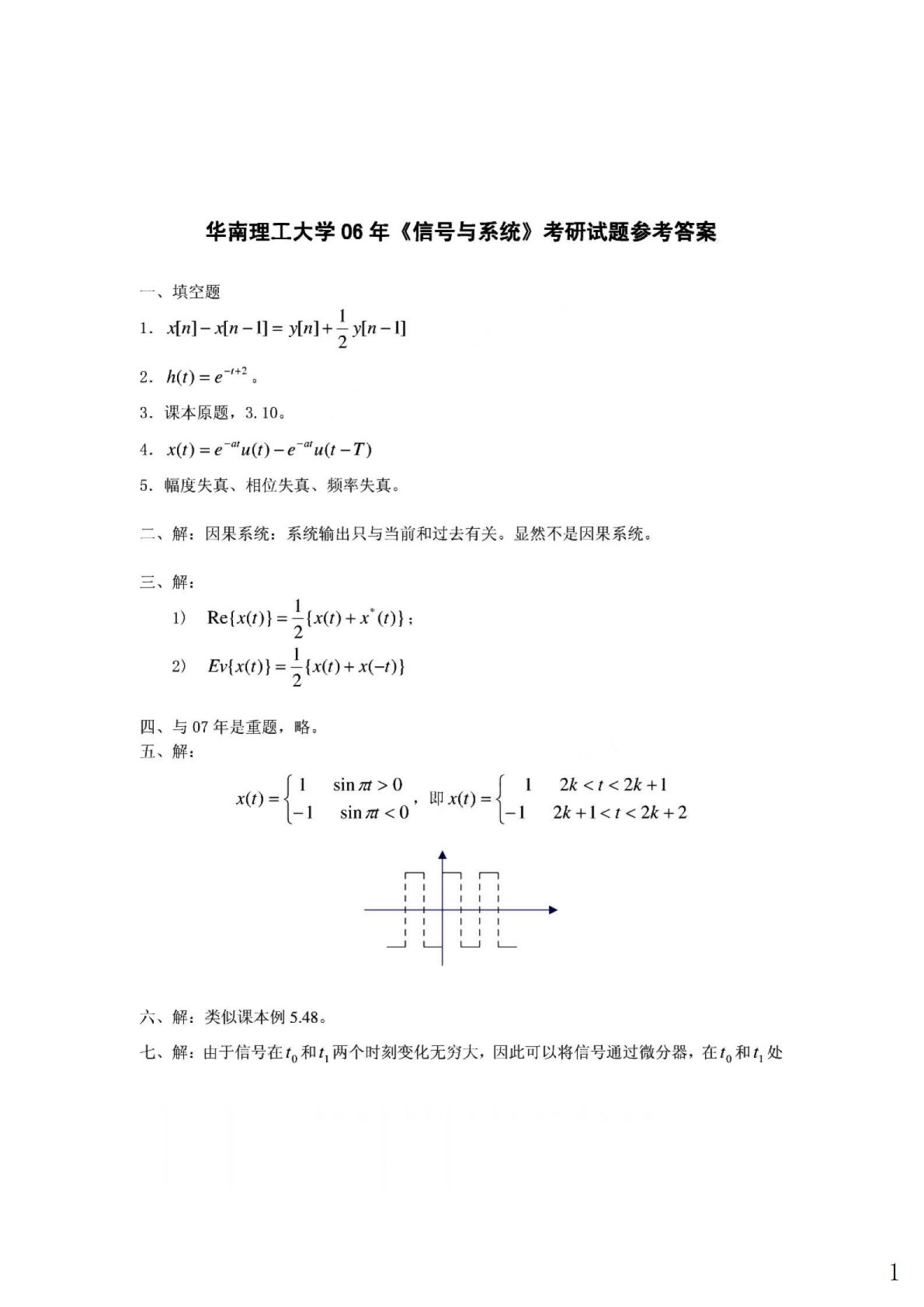 华南理工大学811信号与系统2006年真题答案
