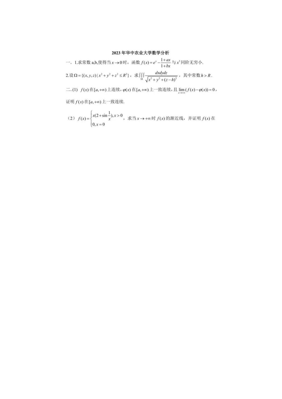 华中农业大学628数学分析2023年真题答案