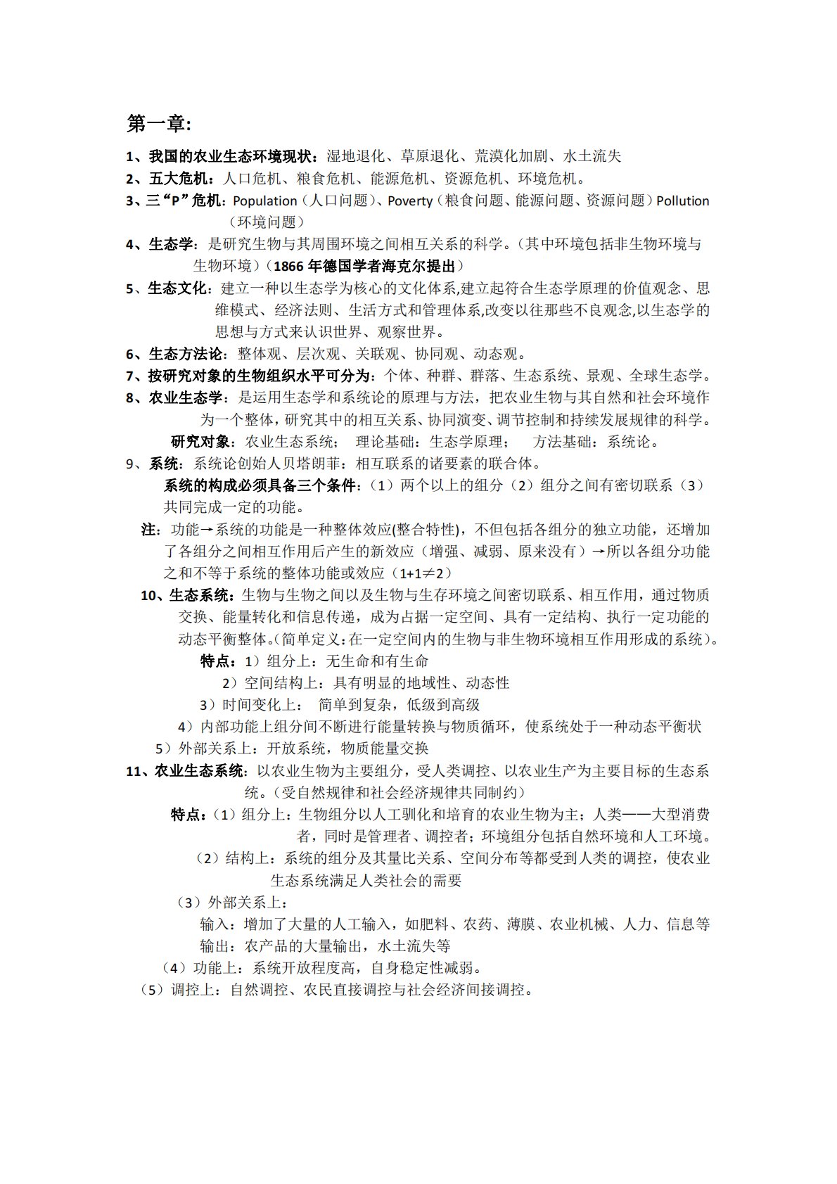 第一章:1、我国的农业生态环境现状:湿地退化、草原退化、荒漠化加剧、水土流失2、五大危机:人口危机、粮食危机、能源危机、资源危机、环境危机。3、三“P”危机:Population(人口问题)、Poverty(粮食问题、能源问题、资源问题)Pollution(环境问题)4、生态学:是研究生物与其周围环境之间相互关系的科学。(其中环境包括非生物环境与生物环境)(1866年德国学者海克尔提出)5、生态文化:建立一种以生态学为核心的文化体系,建立起符合生态学原理的价值观念、思维模式、经济法则、生活方式和管理体系,改变以往那些不良观念,以生态学的思想与方式来认识世界、观察世界。6、生态方法论:整体观、层...