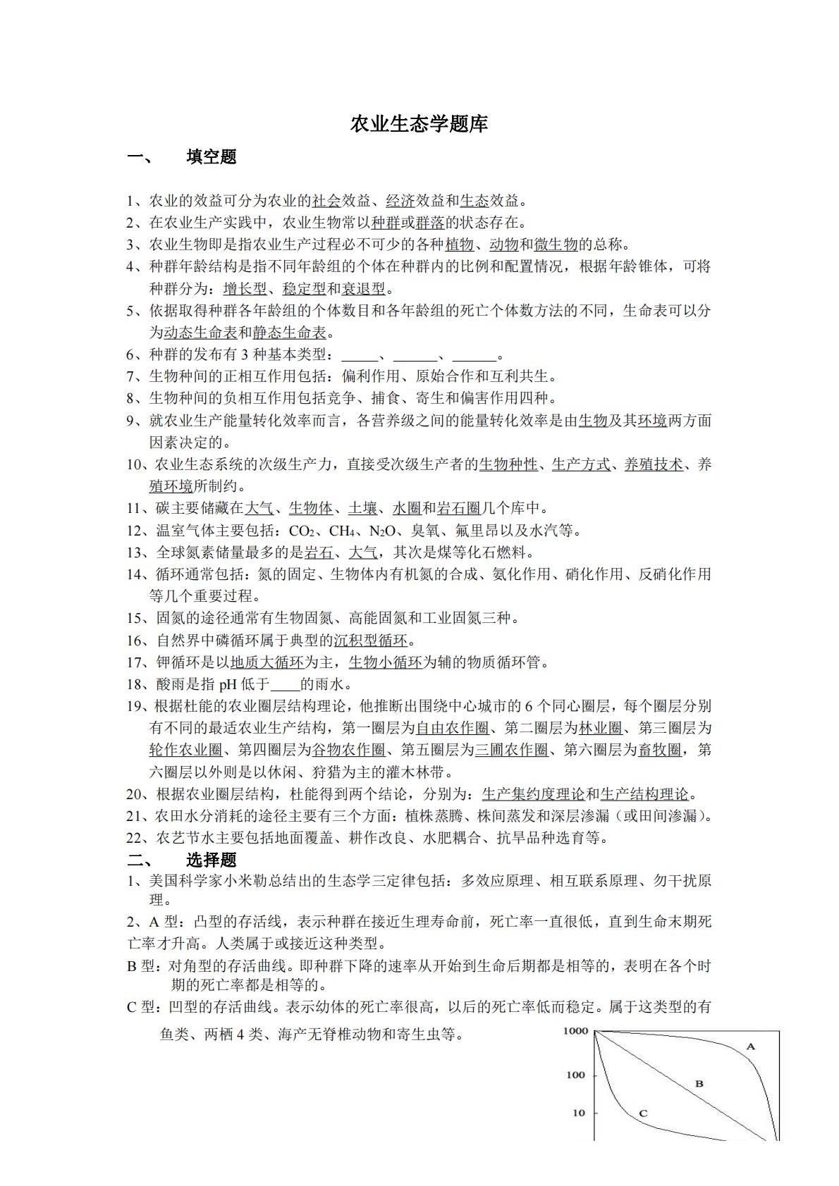 农业生态学题库一、填空题1、农业的效益可分为农业的社会效益、经济效益和生态效益。2、在农业生产实践中,农业生物常以种群或群落的状态存在。3、农业生物即是指农业生产过程必不可少的各种植物、动物和微生物的总称。4、种群年龄结构是指不同年龄组的个体在种群内的比例和配置情况,根据年龄锥体,可将种群分为:增长型、稳定型和衰退型。5、依据取得种群各年龄组的个体数目和各年龄组的死亡个体数方法的不同,生命表可以分为动态生命表和静态生命表。6、种群的发布有3种基本类型:、、。7、生物种间的正相互作用包括:偏利作用、原始合作和互利共生。8、生物种间的负相互作用包括竞争、捕食、寄生和偏害作用四种。9、就农业生产能量...