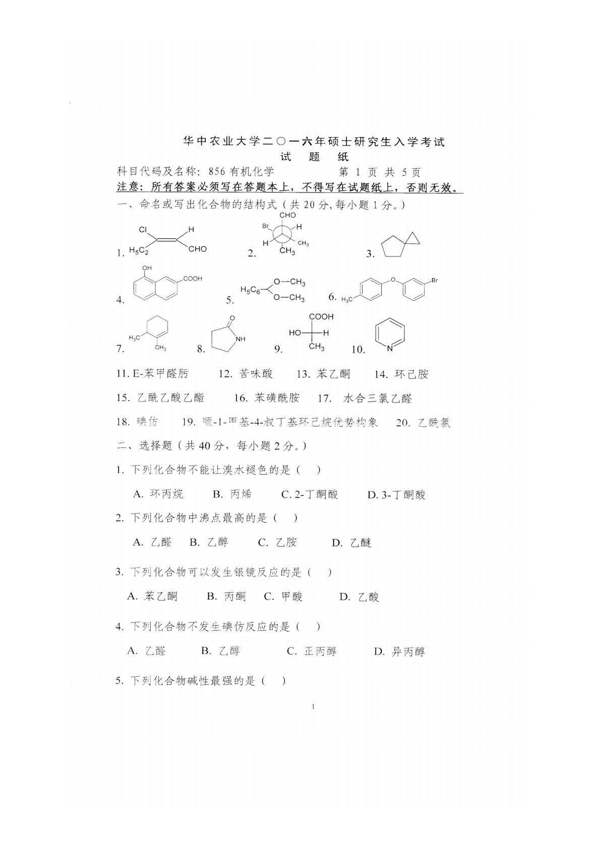 华中农业大学856有机化学2016年真题