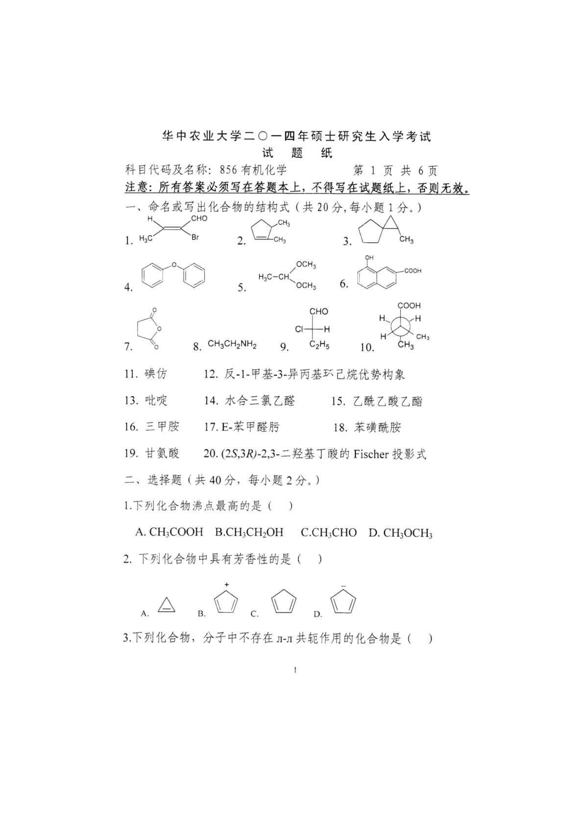 华中农业大学856有机化学2014年真题(1)