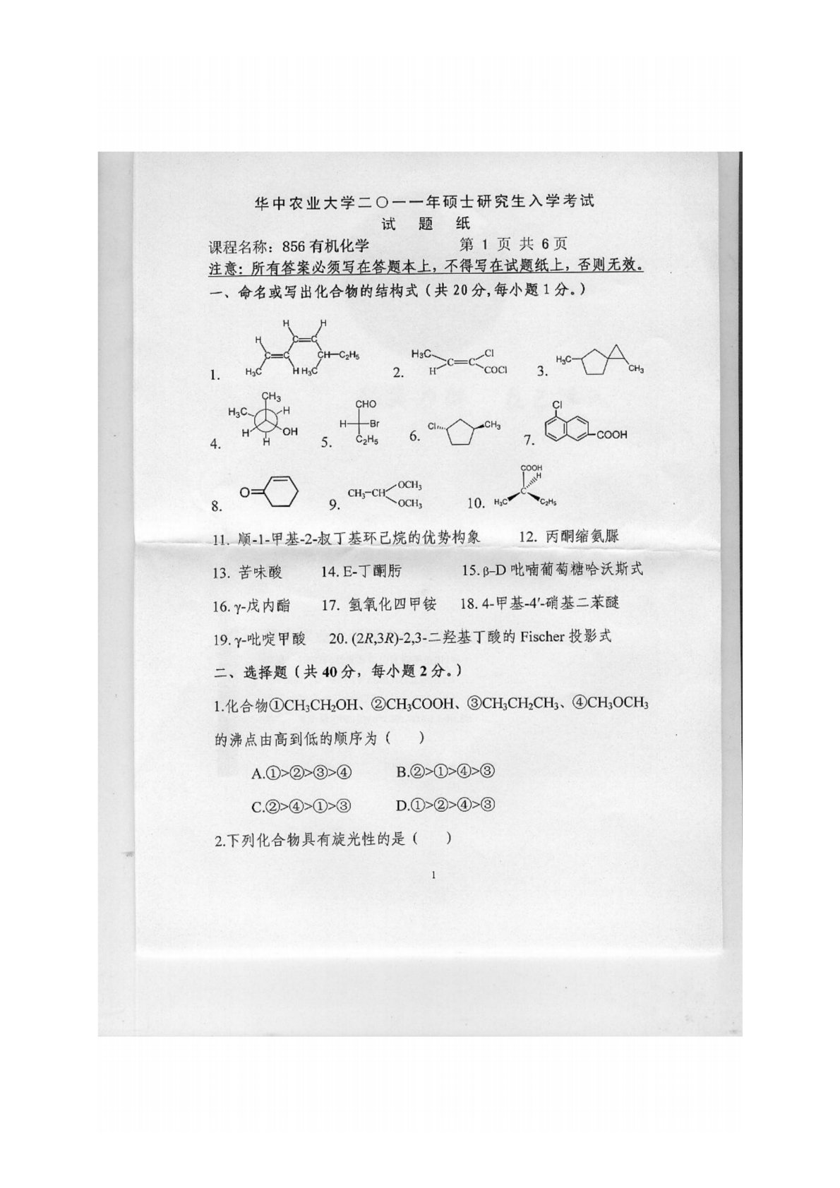 华中农业大学856有机化学2011年真题1