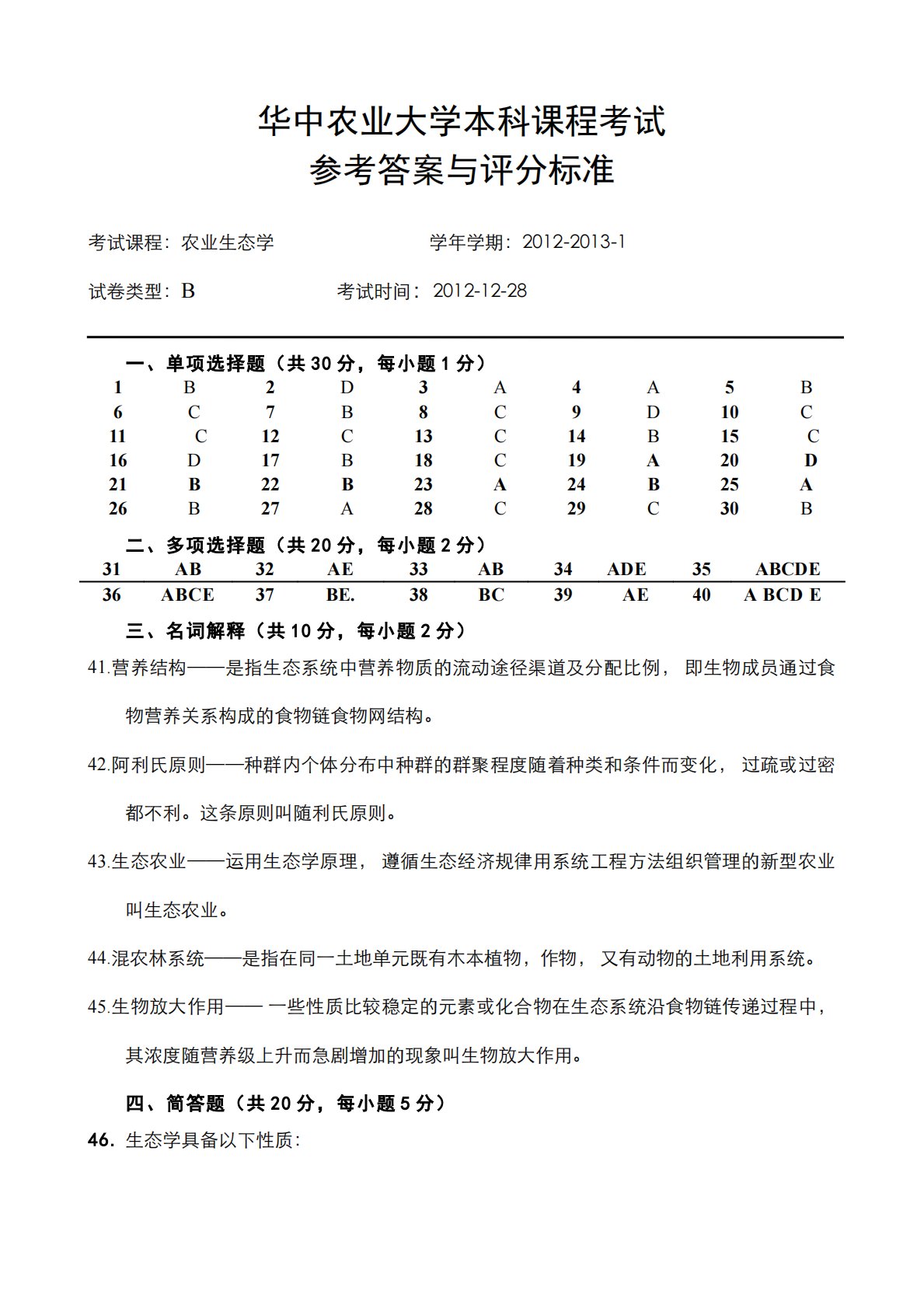 华中农业大学本科课程考试参考答案与评分标准考试课程:农业生态学学年学期:2012-2013-1试卷类型:B考试时间:2012-12-28一、单项选择题(共30分,每小题1分)1B2D3A4A5B6C7B8C9D10C11C12C13C14B15C16D17B18C19A20D21B22B23A24B25A26B27A28C29C30B二、多项选择题(共20分,每小题2分)31AB32AE33AB34ADE35ABCDE36ABCE37BE.38BC39AE40ABCDE三、名词解释(共10分,每小题2分)41.营养结构──是指生态系统中营养物质的流动途径渠道及分配比例,即生物成员通过食物营养关...
