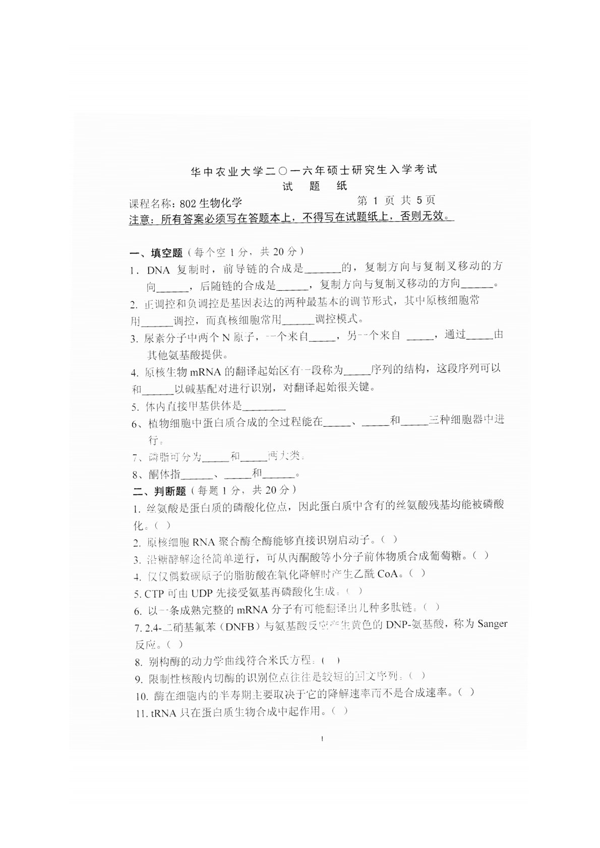 华中农业大学802生物化学2016年真题