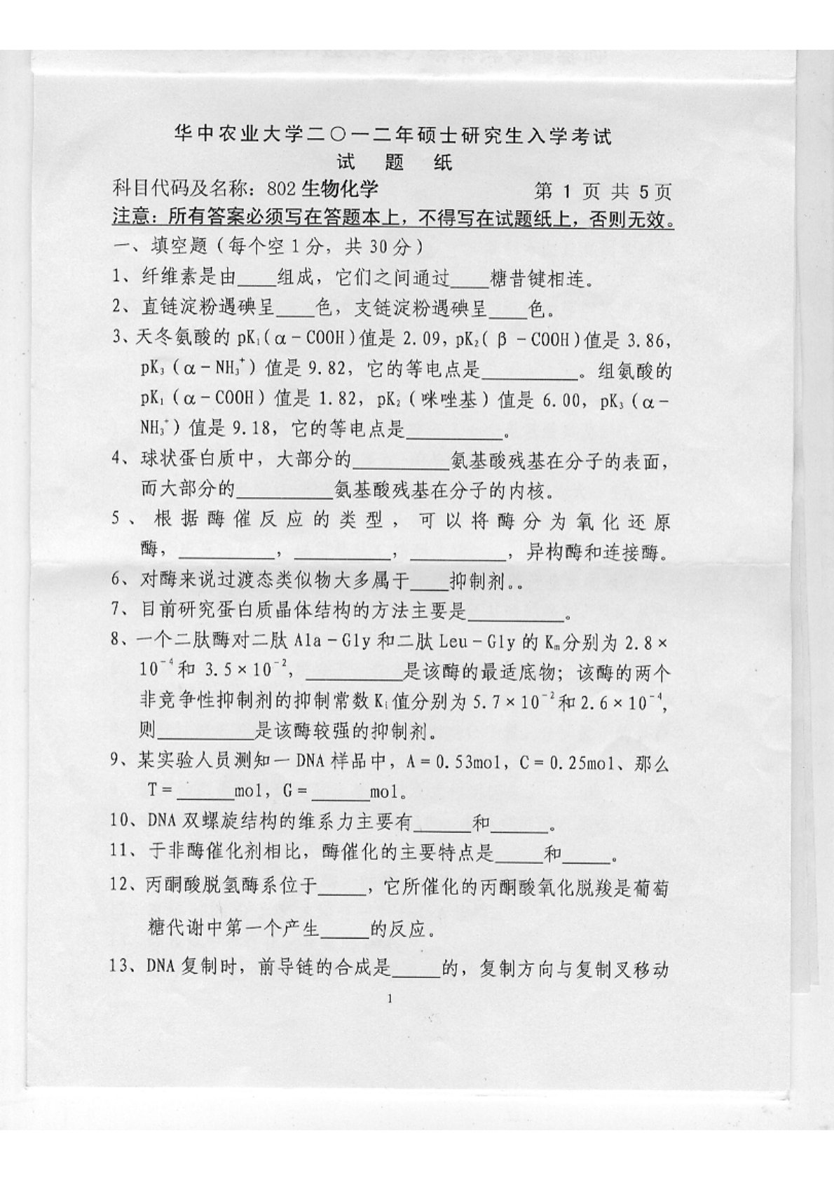 华中农业大学802生物化学2012年真题