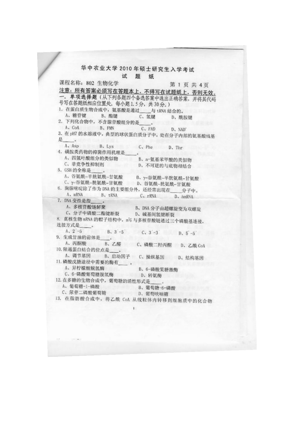 华中农业大学802生物化学2010年真题