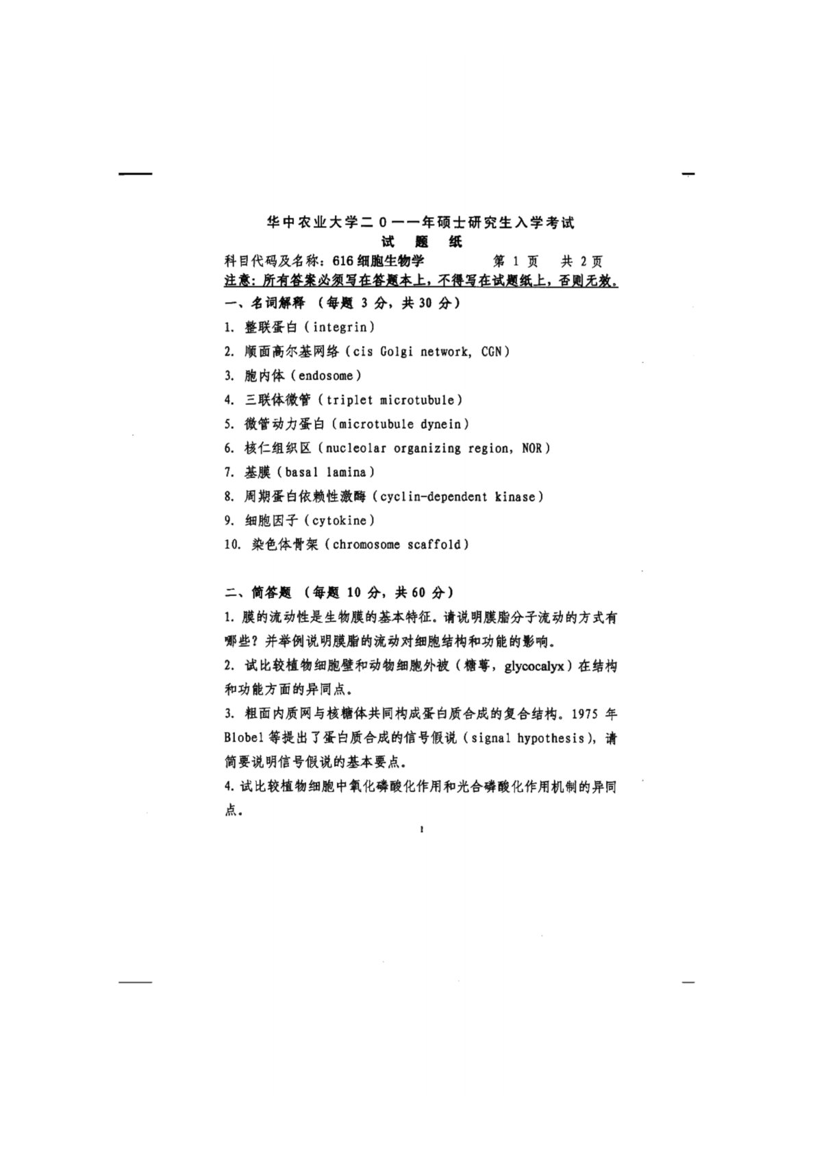 华中农业大学634细胞生物学2011年真题