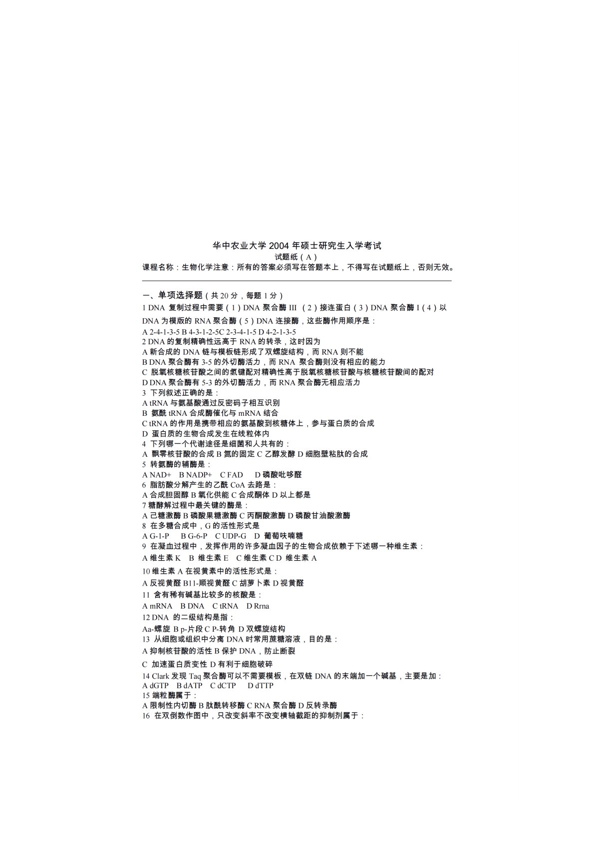 华中农业大学802生物化学2004年真题