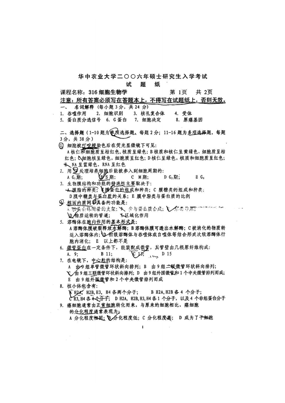 华中农业大学634细胞生物学2006年真题