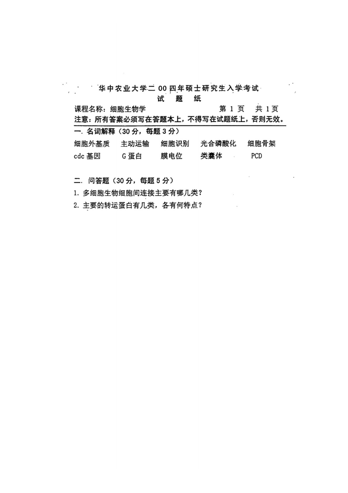 华中农业大学634细胞生物学2004年真题