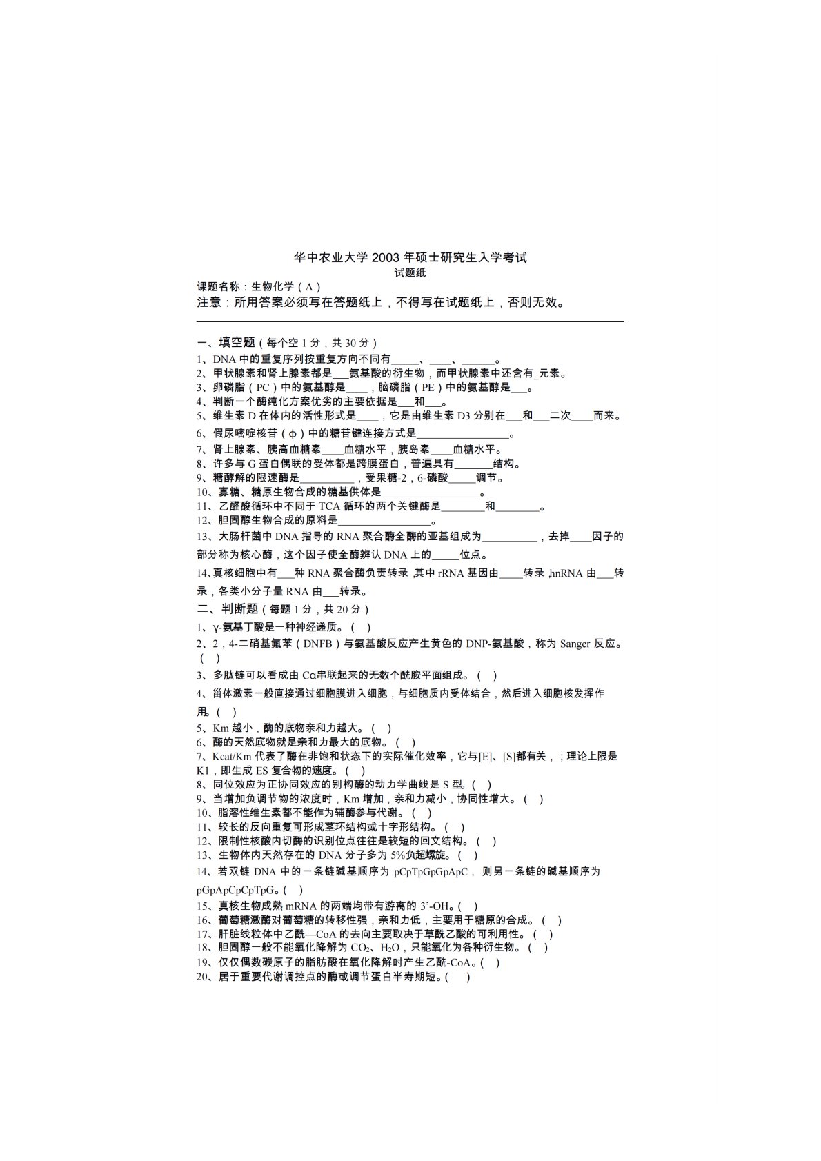 华中农业大学802生物化学2003年真题