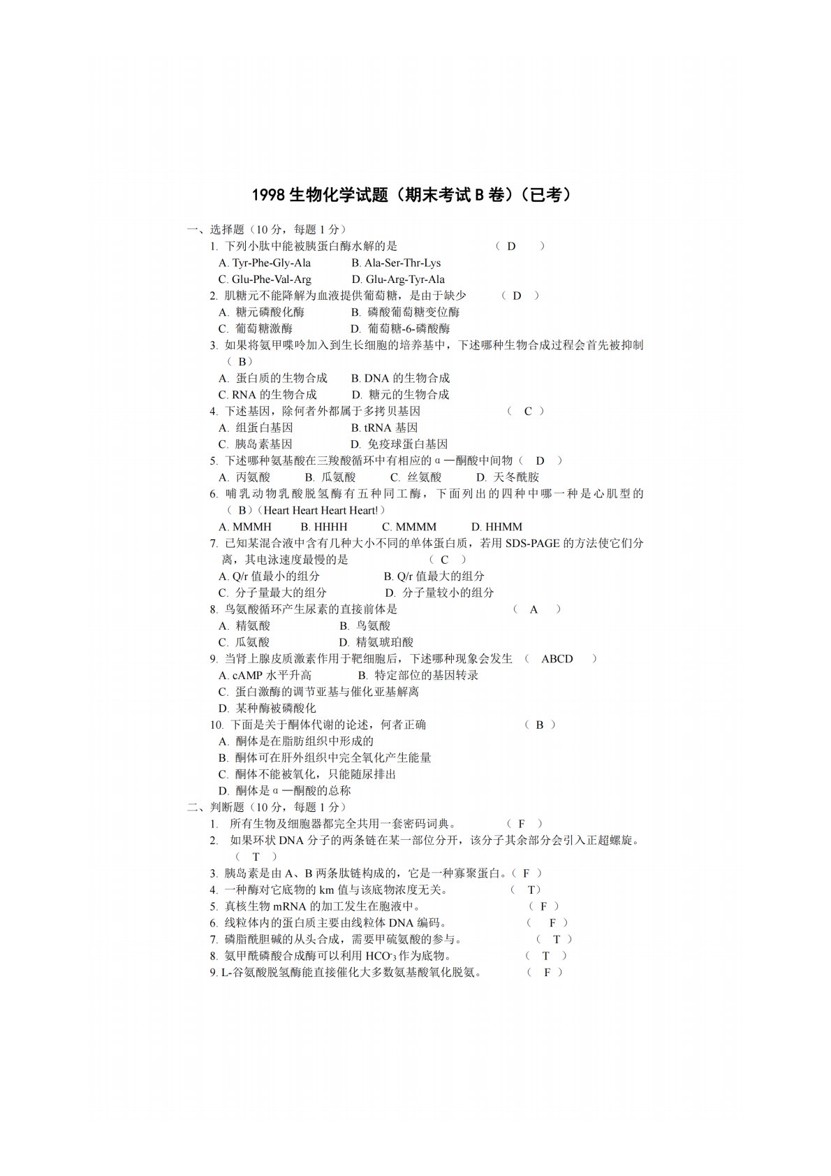 华中农业大学802生物化学1998年真题答案B