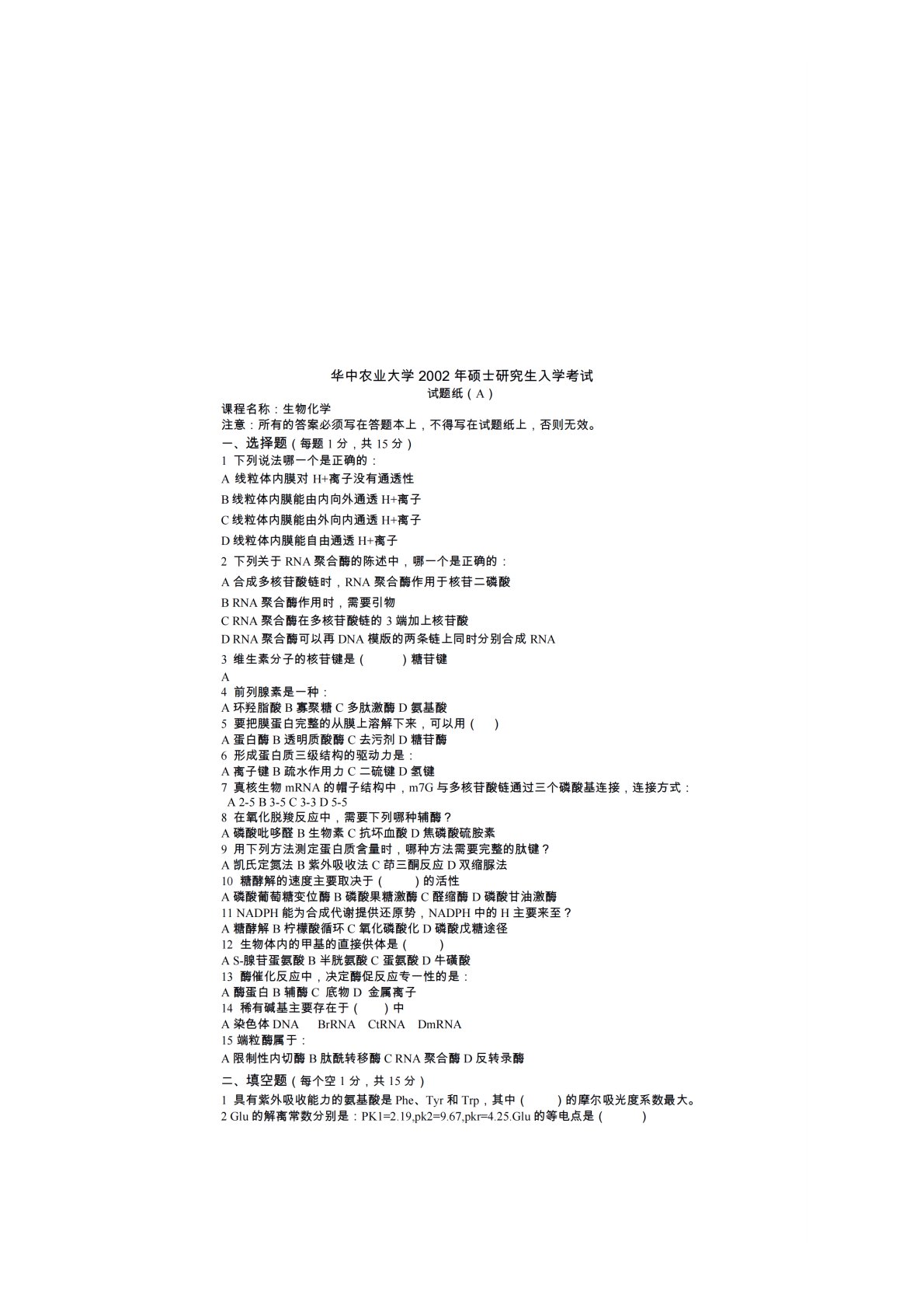 华中农业大学802生物化学2002年真题