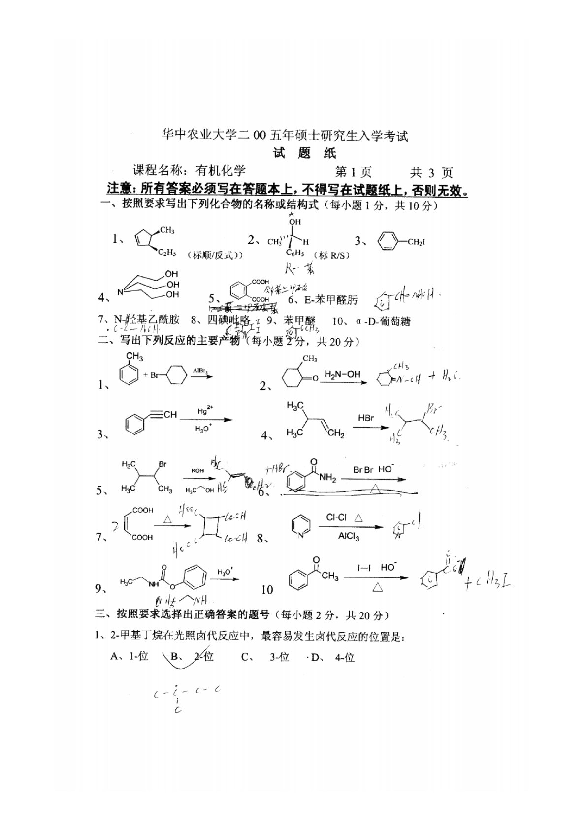 华中农业大学856有机化学2005年真题