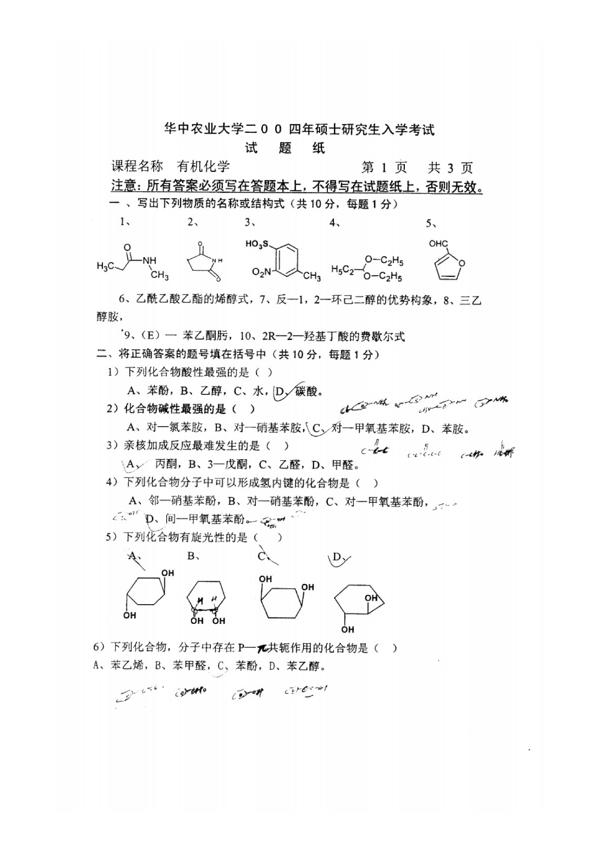华中农业大学856有机化学2004年真题
