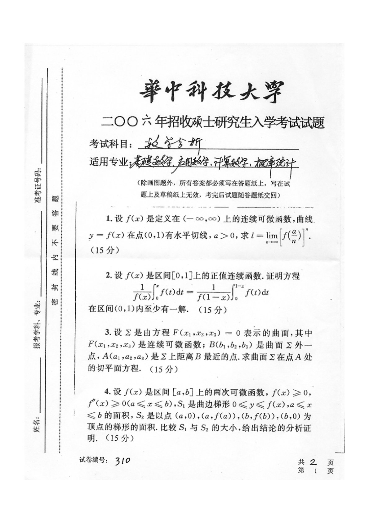 华中科技大学601数学分析2006年真题