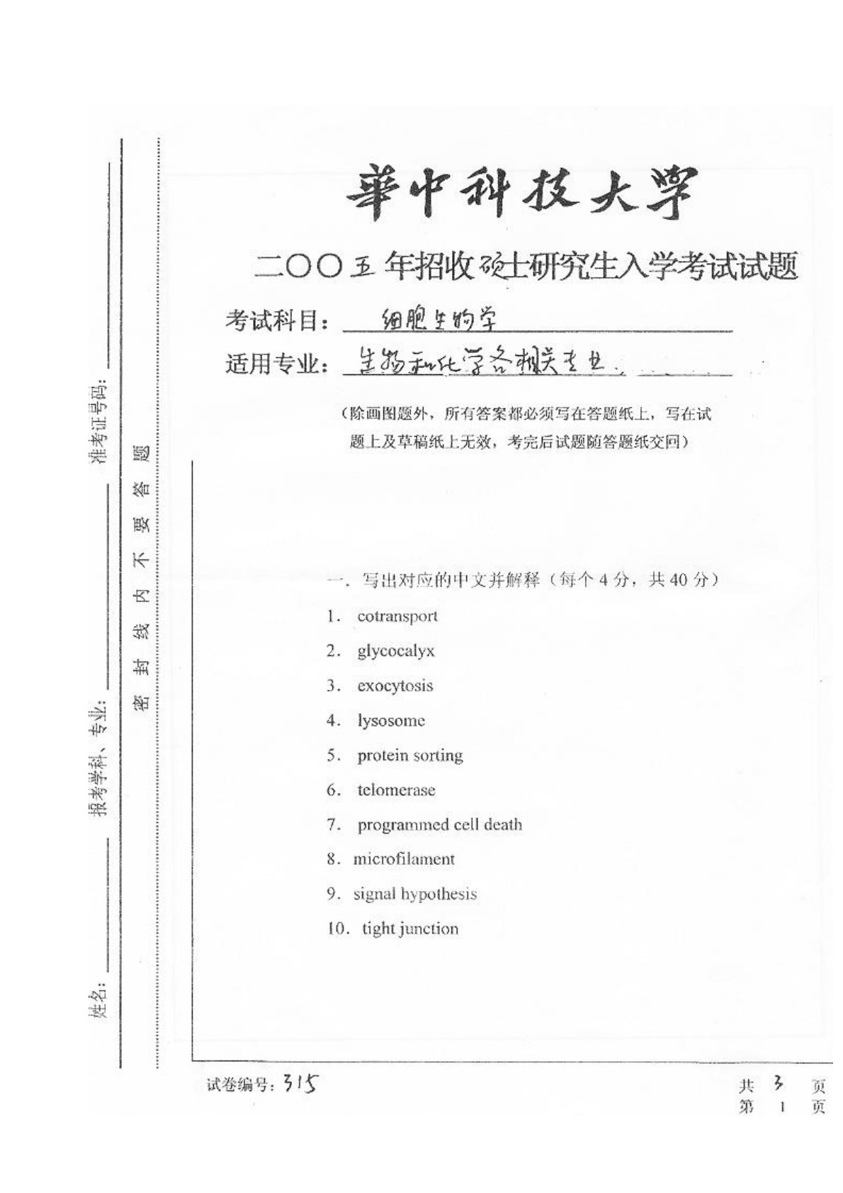 华中科技大学891细胞生物学2005年真题