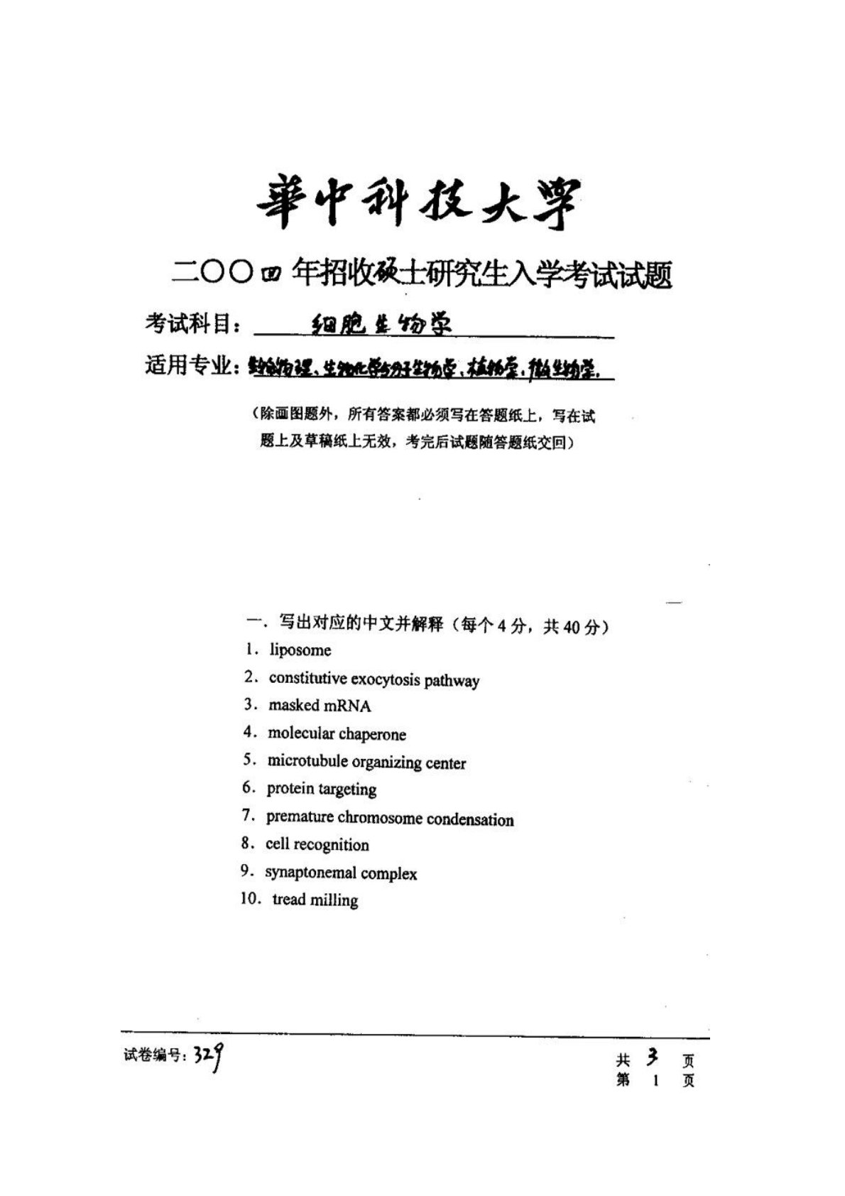华中科技大学891细胞生物学2004年真题
