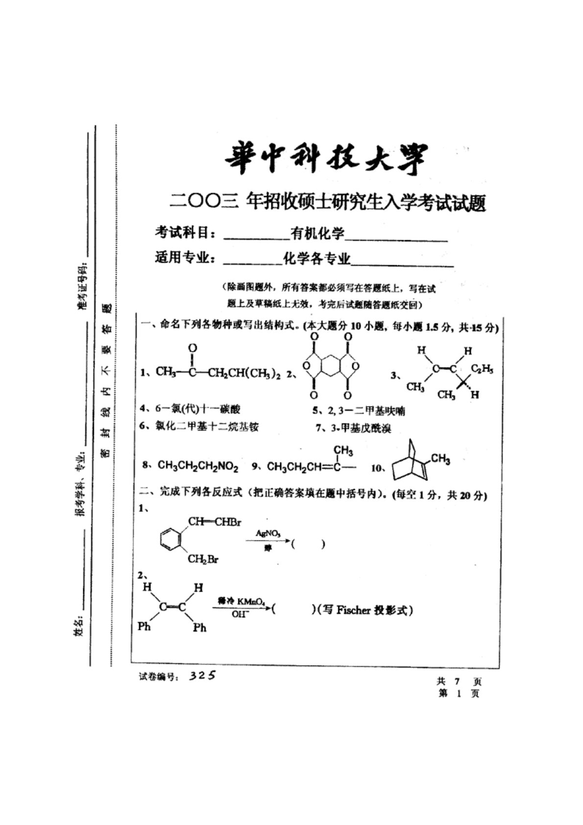 华中科技大学622有机化学2003年真题