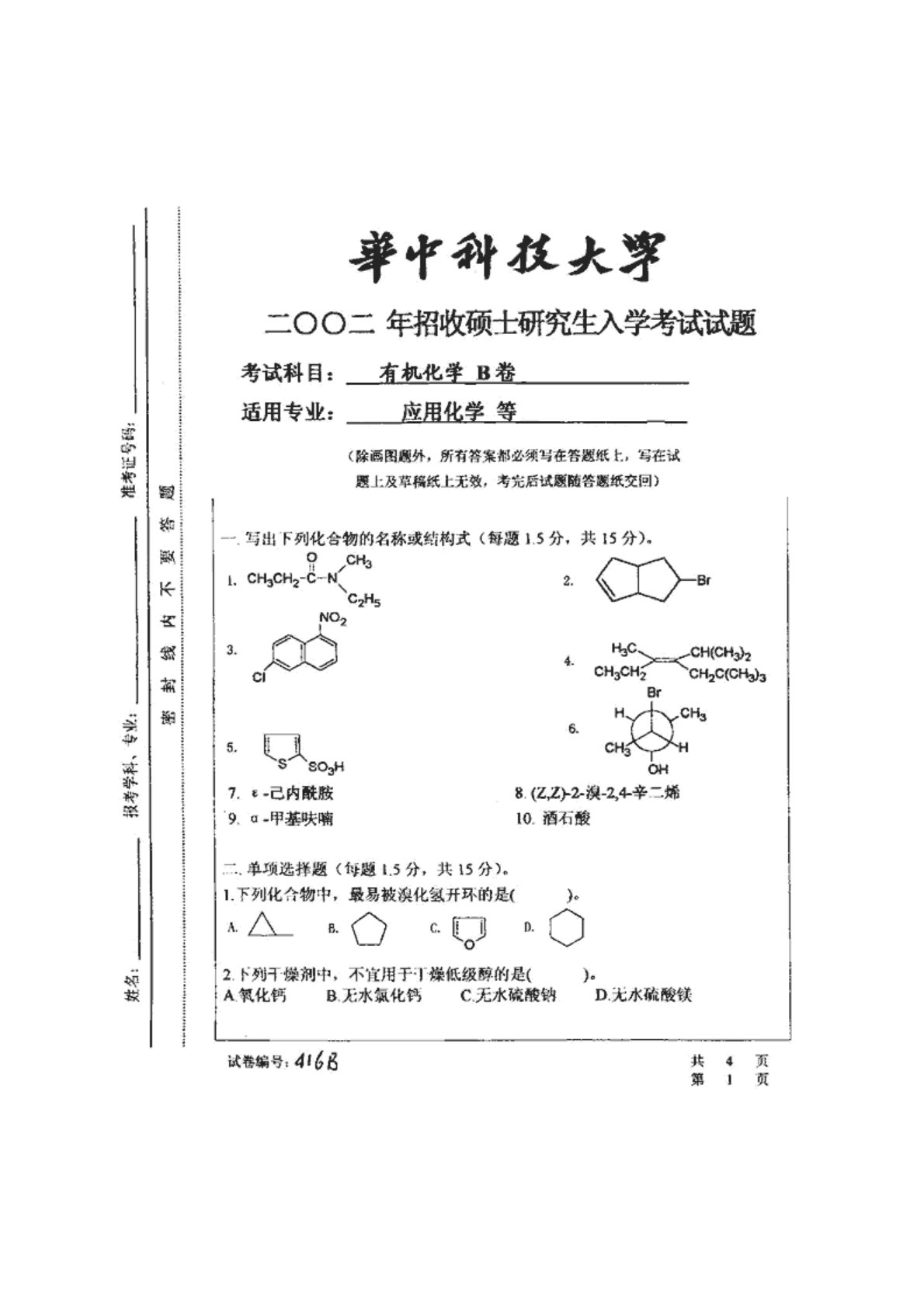 华中科技大学622有机化学2002年真题1