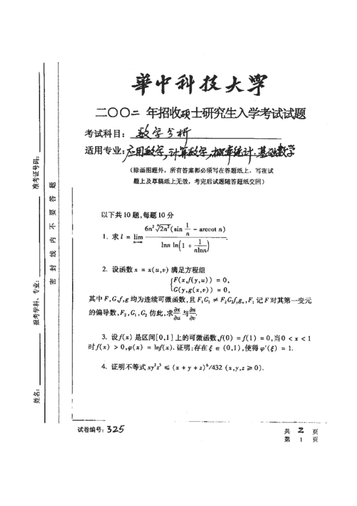 华中科技大学601数学分析2002年真题