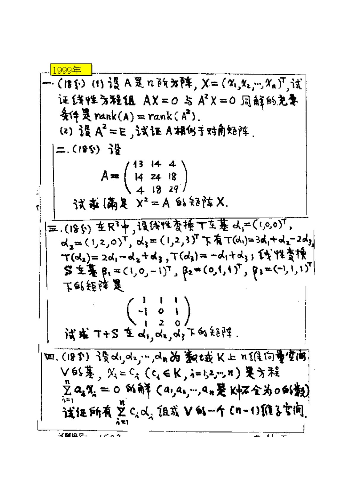 华中科技大学801高等代数1999年真题手写版