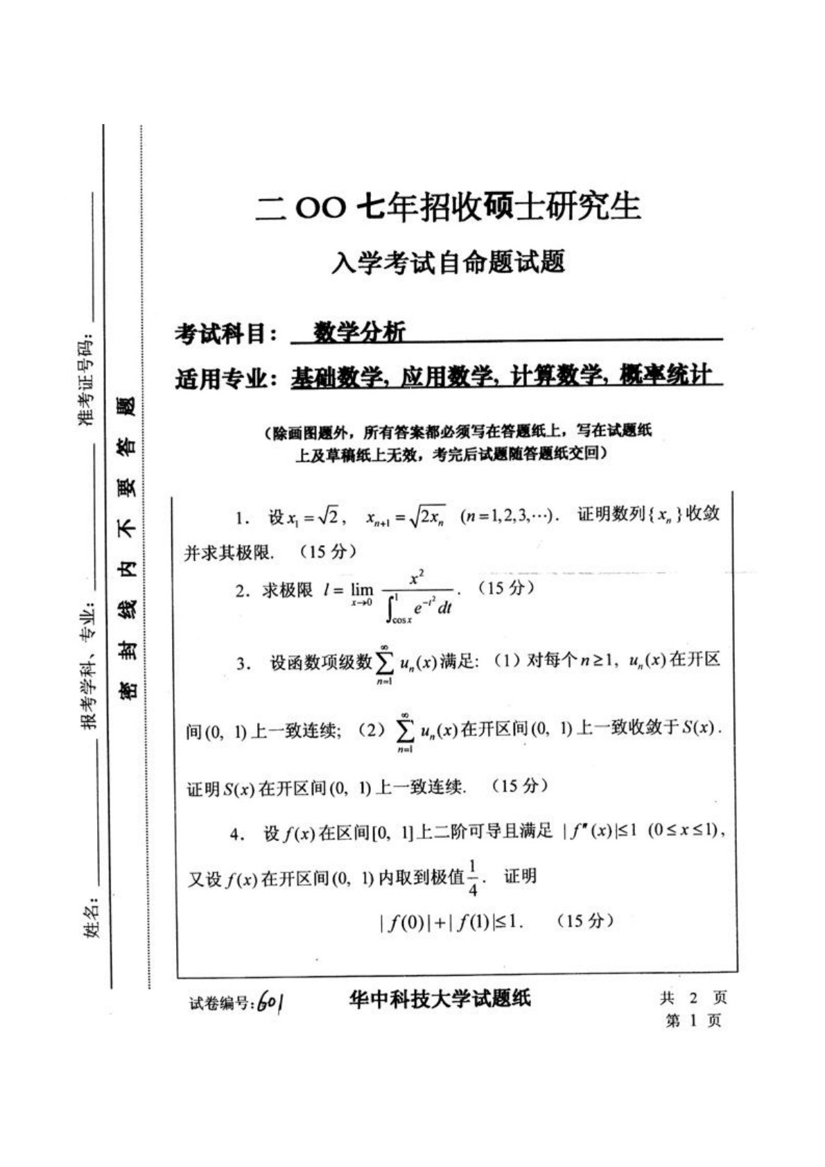 华中科技大学601数学分析2007年真题