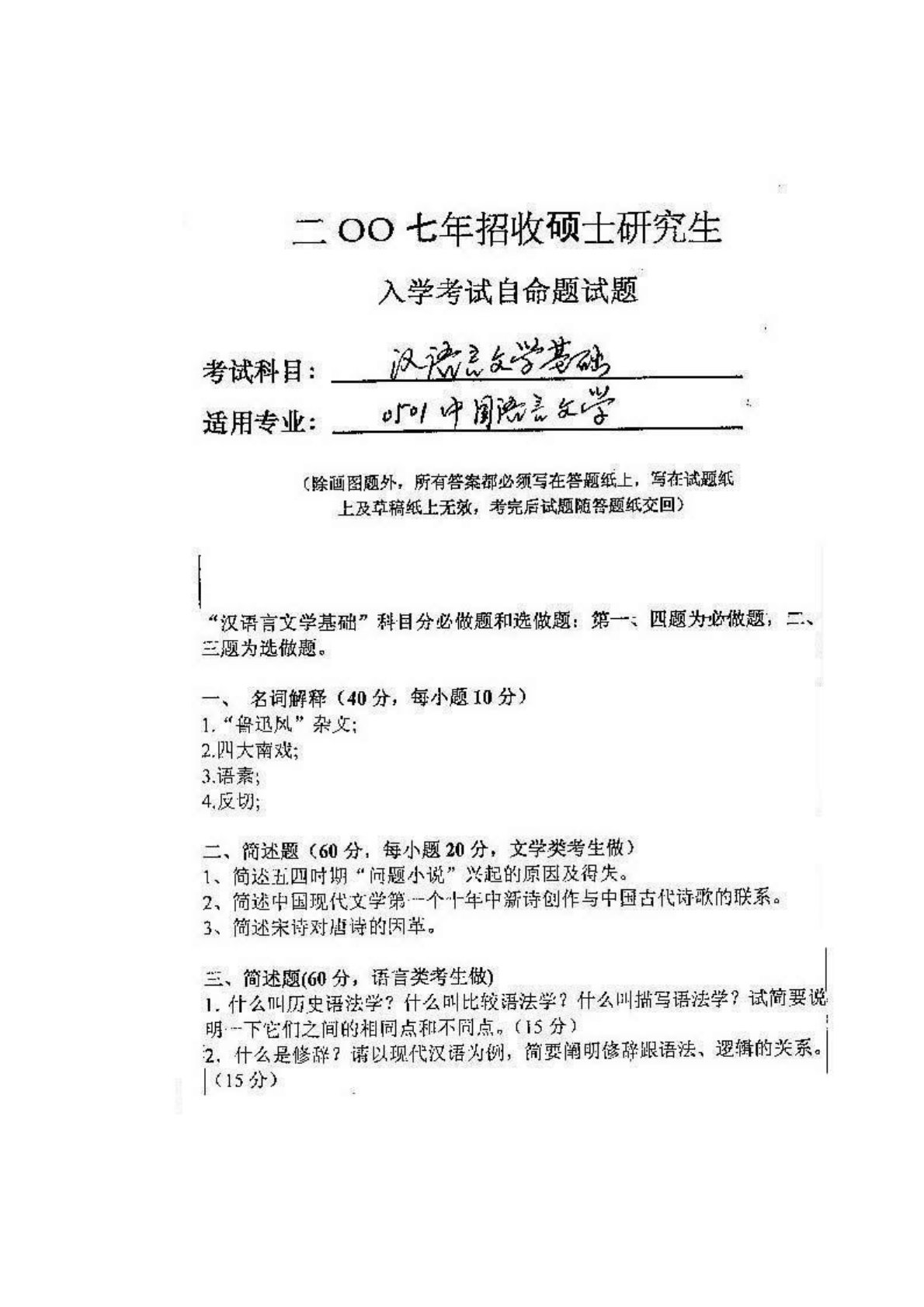 华中科技大学610汉语言文学基础2007年真题