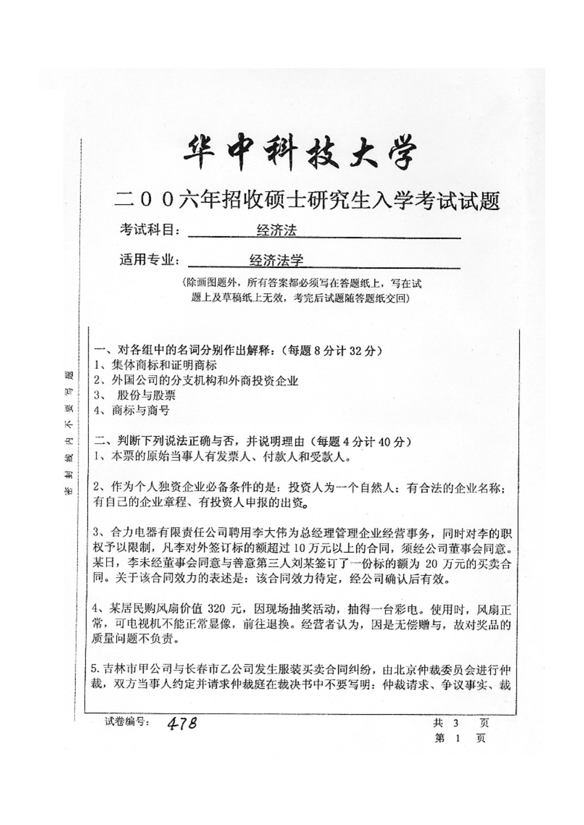 华中科技大学850经济法2006年真题1