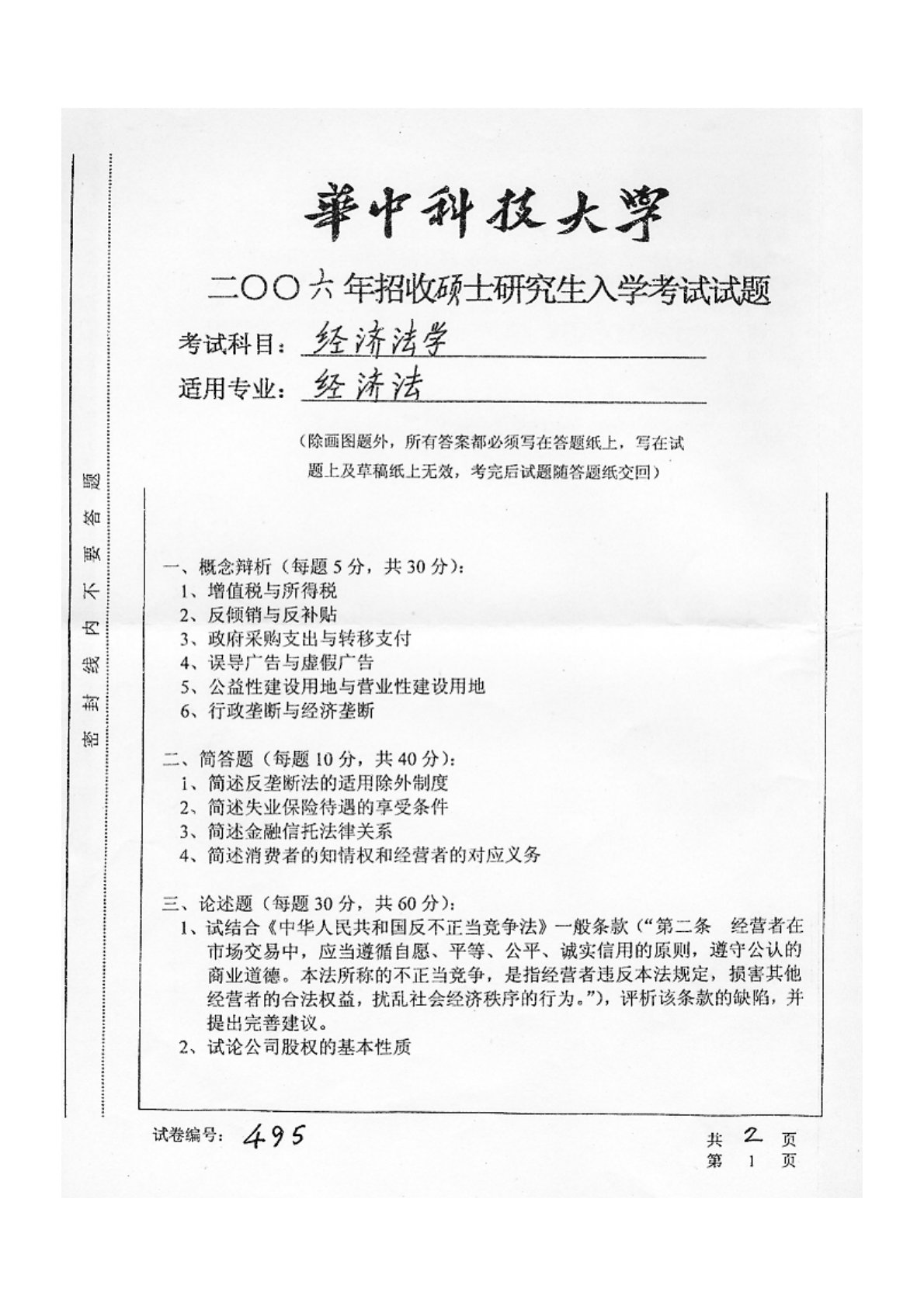 华中科技大学850经济法2006年真题