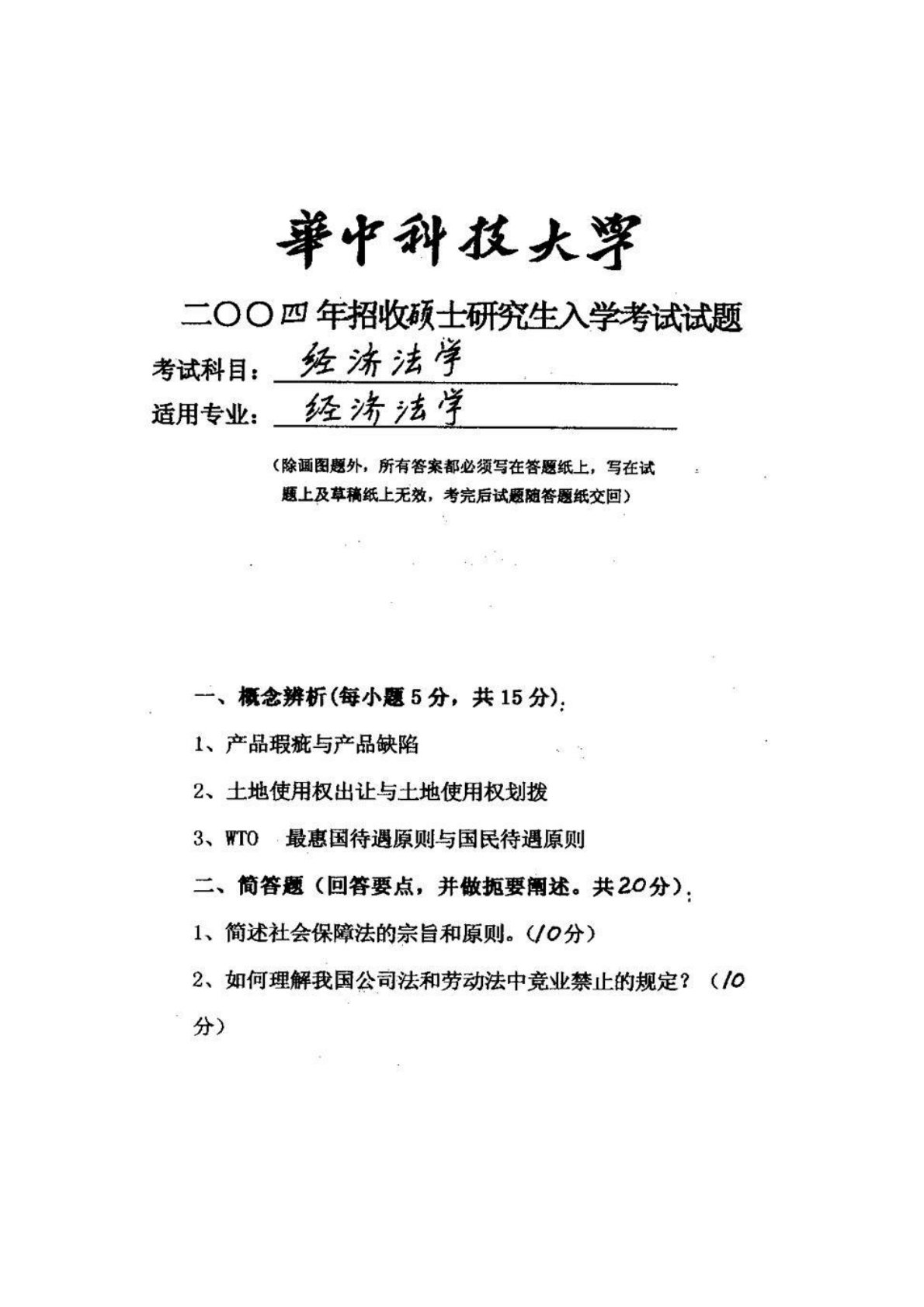 华中科技大学850经济法2004年真题