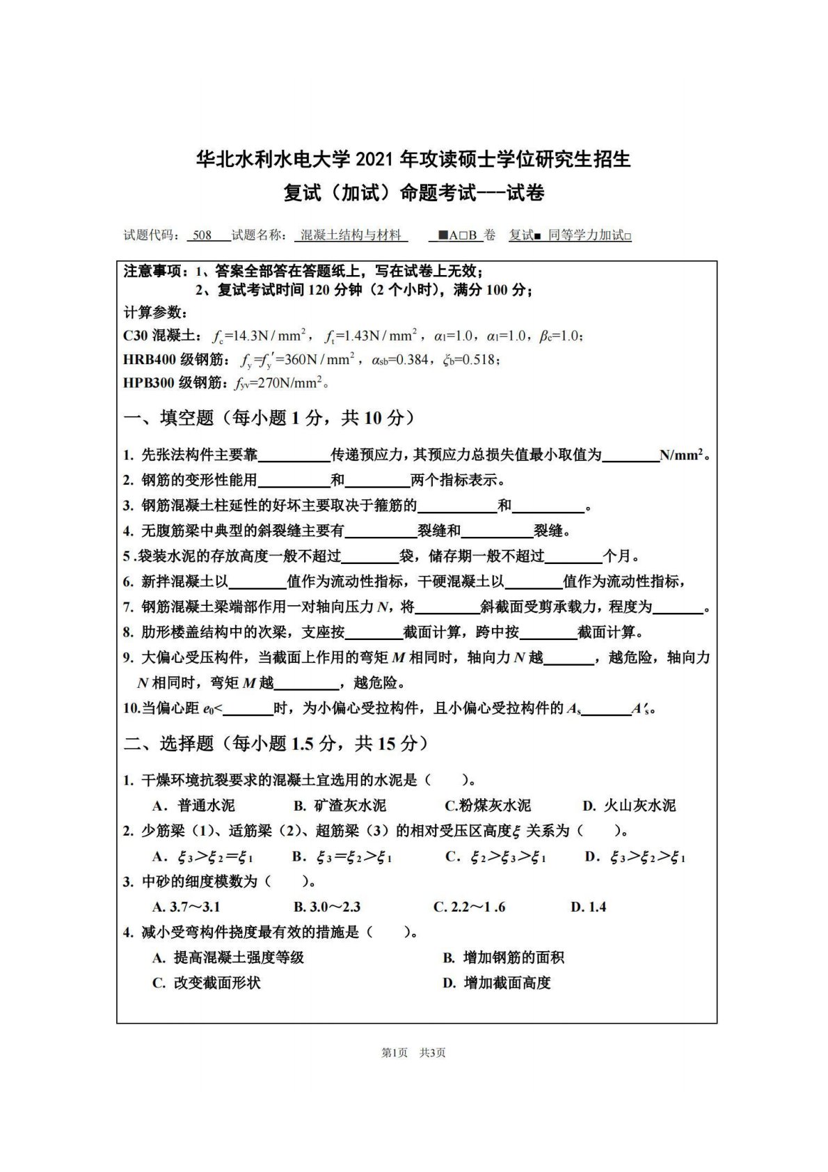 华北水利水电大学508混凝土结构与材料(复试)2021年复试真题