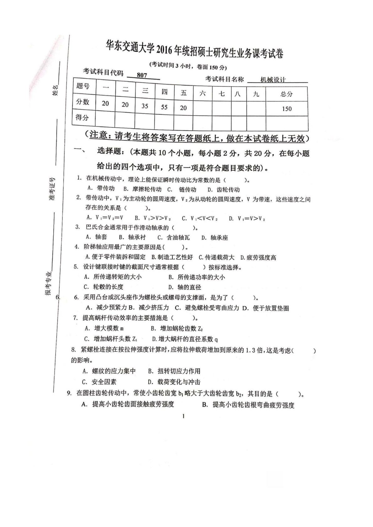 华东交通大学807机械设计2016年考研真题