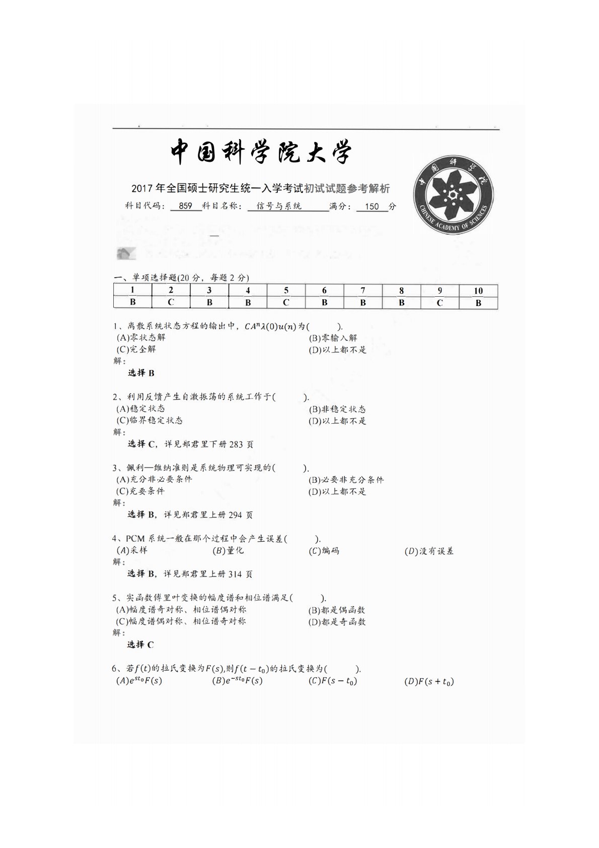 中国科学院大学859信号与系统2017年真题答案