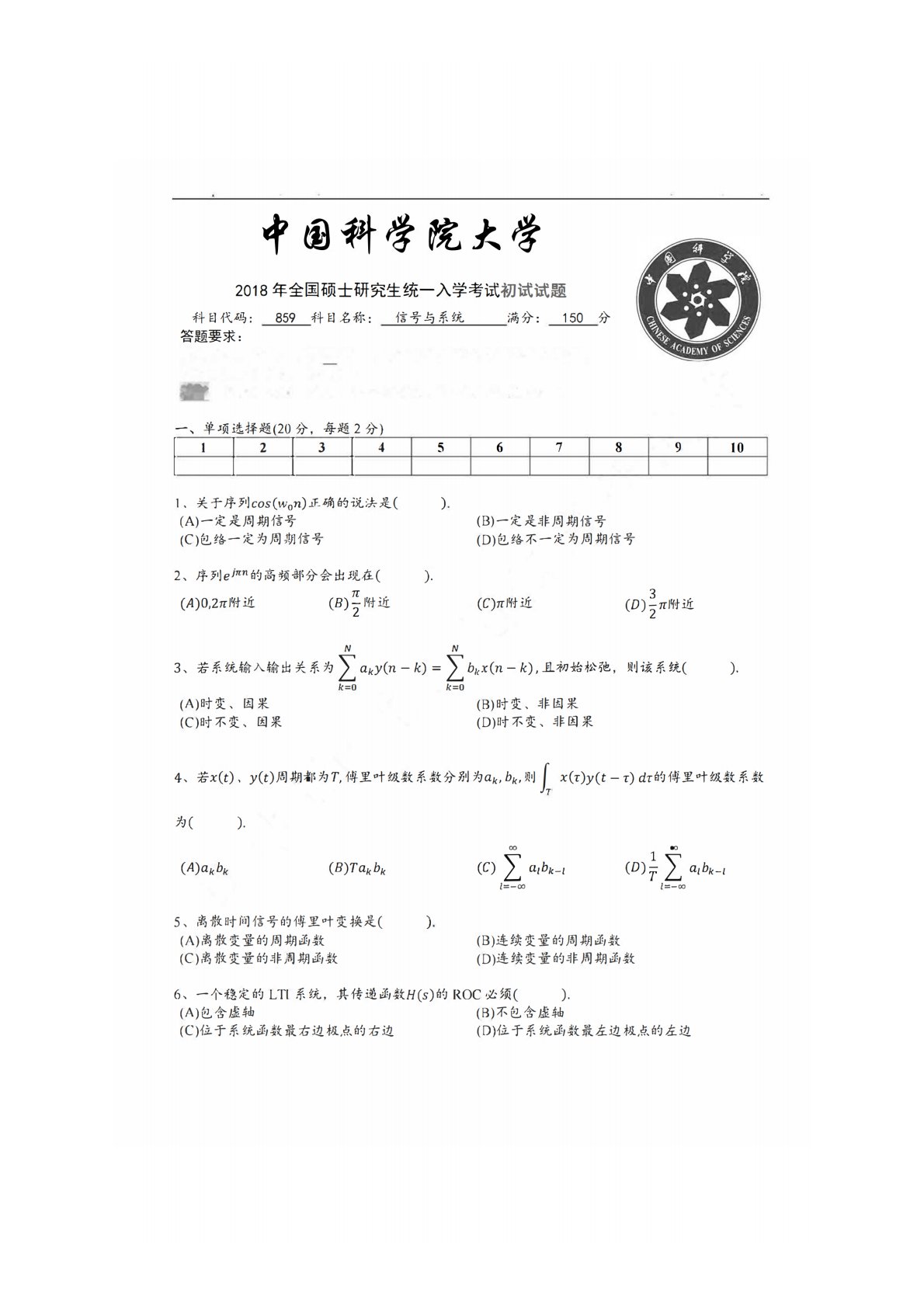 中国科学院大学859信号与系统2018年真题